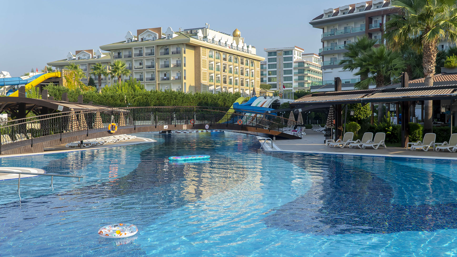 Sadržaj hotela: Recepcija,lobi,glavni restoran,a la carte restorani,barovi,poslastičarnica,mini club za decu,mini disco,otvoren bazen sa toboganima,zatvoren bazen,relax bazen,fitness centar,stoni tenis,pikado,odbojka na plaži,tursko kupatilo,sauna,parno kupatilo