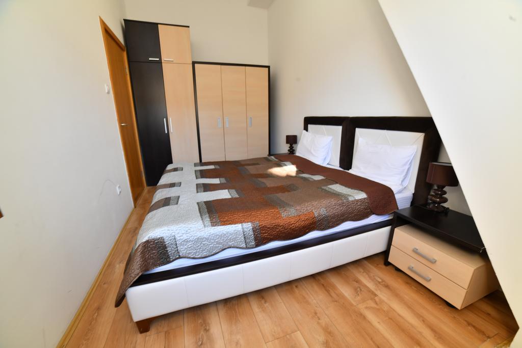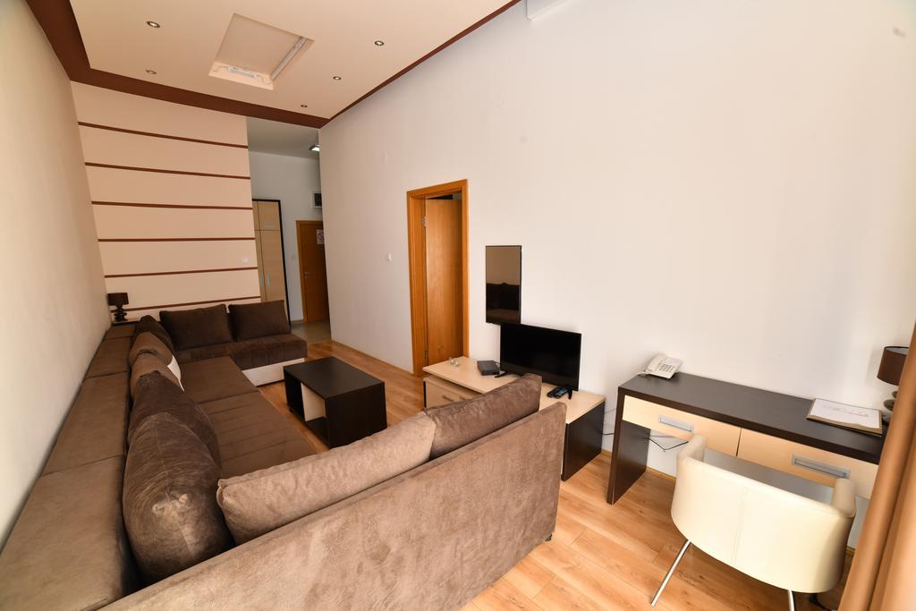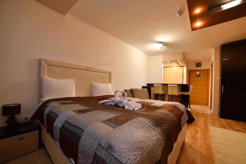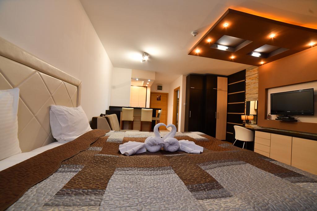 - Kraljevski apartman 4+2 (max 6 osoba):najluksuzniji deo ponude, apartman 140 m2 , sa spavaćom sobom sa francuskim ležajem + spavaća soba na spratu (francuski ležaj) + dnevni boravak sa zidovima obloženim dekorativnim kamenom i difuznom halogenom i LED rasvetom, kompletno opremljenom kuhinjom, dva kupatila (tuš, fen, sauna, jakuzzi, bademantil, papuče), smart TV u dnevnoj sobi + TV led u svakoj spavaćoj sobi, telefon, sef, minibar, wireless internet.Nalazi se u objektu Zoned 1.