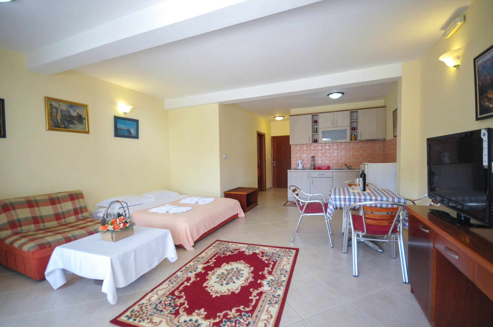 Četvorokrevetni apartman: Broj osoba: 4, Broj kreveta: 2 bračna. Odovojene spavaće sobe, terasa, parking, klima uredjaj, grijanje, TV, peškiri, bezični pristup internetu, šporet, frižider, opremljena kuhinja