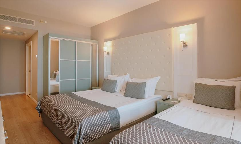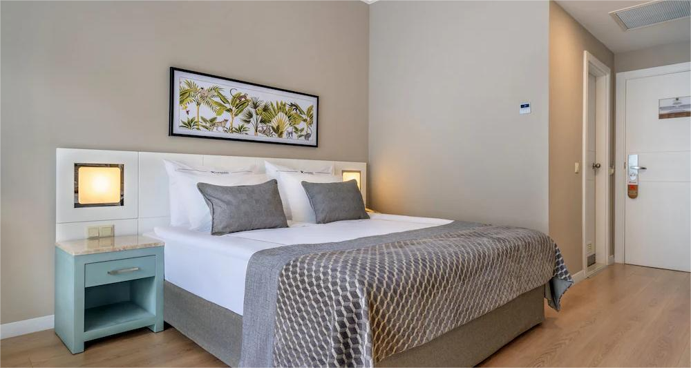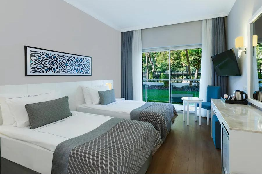 Hotel ima ukupno 360 soba koje su raspoređene u dva bloka. Hotel ima i annex zgradu koja nema lift. Standard sobe (24 -27m2; spavaća soba, kupatilo, balkon max.2+1pax), Superior sobe (30m2, u annex zgradi, jedna spavaća soba sa bračnim krevetom + dodatni krevet + sofa, kupatilo, balkon, max. 3+1pax), porodične sobe (32-40m2, u annex zgradi, dve spavaće sobe povezane vratima, kupatilo, francuski balkon max.4pax,) tri sobe su prilagođene osobama sa invaliditetom. Sve sobe imaju kupatilo sa tuš kabinom, fen, bademantile, papuče, split klima uređaj, telefon, mini bar ( voda, bezalkoholna pića i pivo se dopunjavaju svaki dan), aparat za kafu ( kapsule za aparat i keks se nadopunjavaju svaka dva dana), sef, WI – FI internet, SAT TV sa muzičkim kanalima, balkon ili francuski balkon.