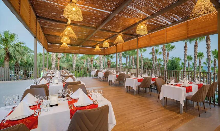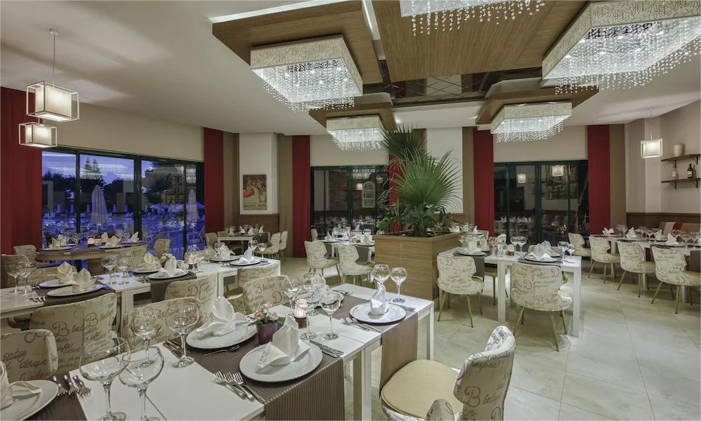 Ultra all inclusive - švedski sto za doručak, kasni doručak, jutarnji snack, ručak, poslepodnevni snack, kolači, čaj, kafa, sendviči, sladoled, sveže ceđeni sokovi, večeru i kasni snack. Sva lokalna i neka uvozna alkoholna i bezalkoholna pića, turska kafa, mini bar u sobi sa sokovima, pivo, voda, lješnjaci i čokolada nadopunjuju se svaki dan. A’la Carte restorani sa rezervacijom unapred (samo jedan u toku boravka je besplatan, drugi se plaća), room servis od 24.00-06.00h se ne naplaćuju. Dijetalni i dečiji bife se nalaze u glavnom restoranu. Stari viski, brendi, posebna vina, flaširana pića, room servis od 06.00-24.00 časa posebno se naplaćuju.