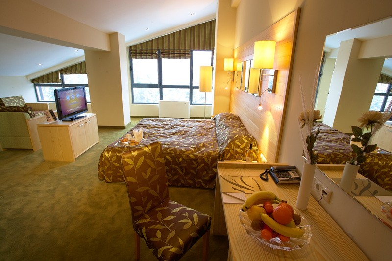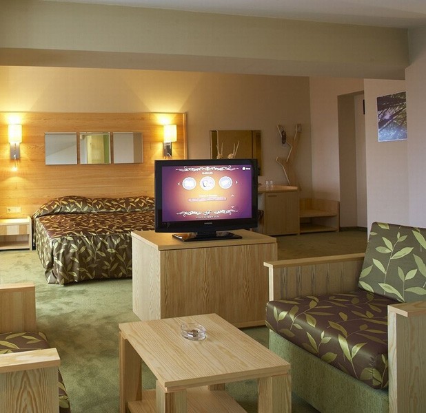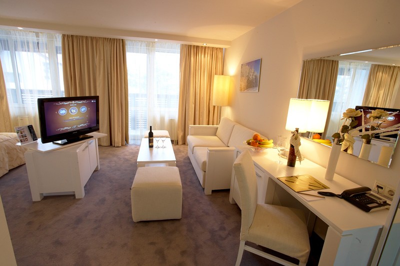 - Junior Suite za 2-4 osobe (25 m2): soba veće kvadrature sa francuskim ležajem i sofa na razvlačenje za dve odrasle osobe i/ili dvoje dece.