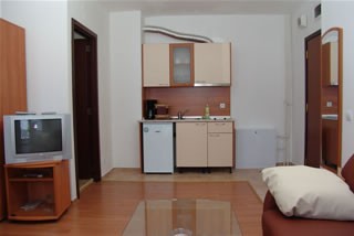 - Jednosobni apartman za 2-4 osobe (2+2): spavaća soba sa francuskim krevetom i dnevni boravak sa sofom na razvlačenje, kuhinja, frižider, SAT TV, kupatilo sa tuš kabinom i balkon.