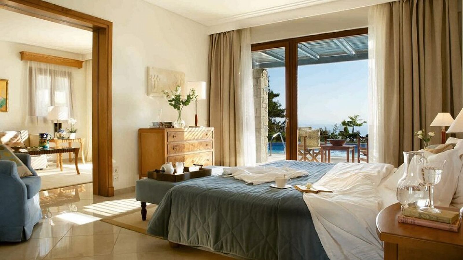 Junior Suite Pool View - odvojena spavaća soba gledaju na bazen, u gornjem delu hotelskog kompleksa.