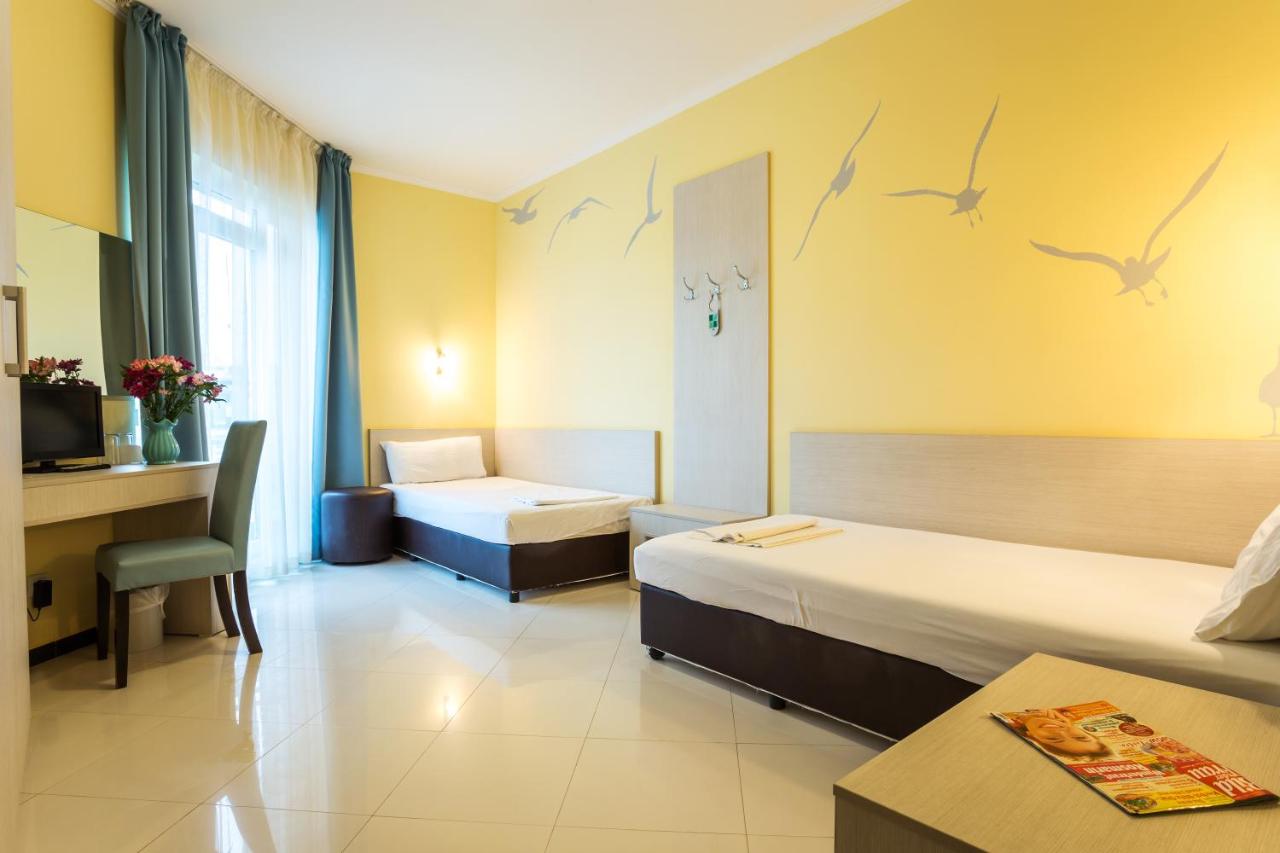Smeštaj: Hotel poseduje 83 kompletno opremljene sobe i apartmane. Sve smeštajne jedinice su klimatizovane i poseduju: TV, telefon, frižider ili mini bar, Wi-Fi internet, kuvalo, kupatilo sa tušem, fen , balkon. Sobe mogu imati sofu ili fotelju na razvlačenje kao dodatni ležaj, kao i pogled na grad ili na more.