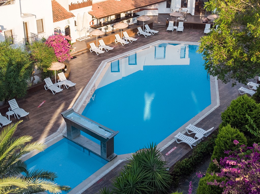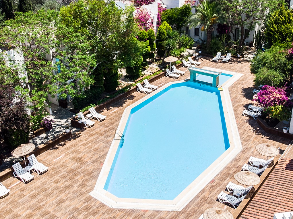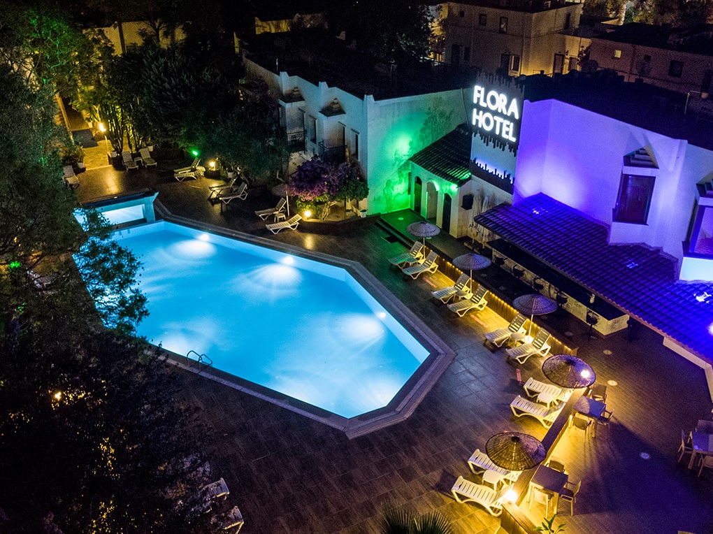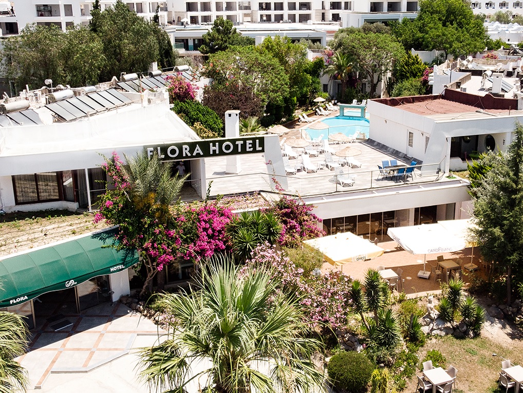 Hotel Club Flora, Bodrum (Turska) - Nalazi se samo 100 metara od plaže u zalivu Gumbet, 2 km od centra Bodruma, odmah ispod belih kupolastih kišnih cisterni po kojima je zaliv dobio ime. Čak i po zagušljivoj letnjoj vrućini, hladan povetarac koji struji sa Bosfora ka obali i moru koje se polako produbljuje sa obale, su razlozi zbog kojih je plaža Gumbet odličan izbor.