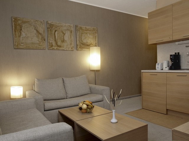 Jednosobni apartman za 2-3 osobe (2+1): oko 35 m2, spavaća soba sa francuskim ležaje, dnevni boravak sa dvosedom na raslapanje. Namenjen smeštaju maksimalno dve odrasle osobe i jednog deteta.