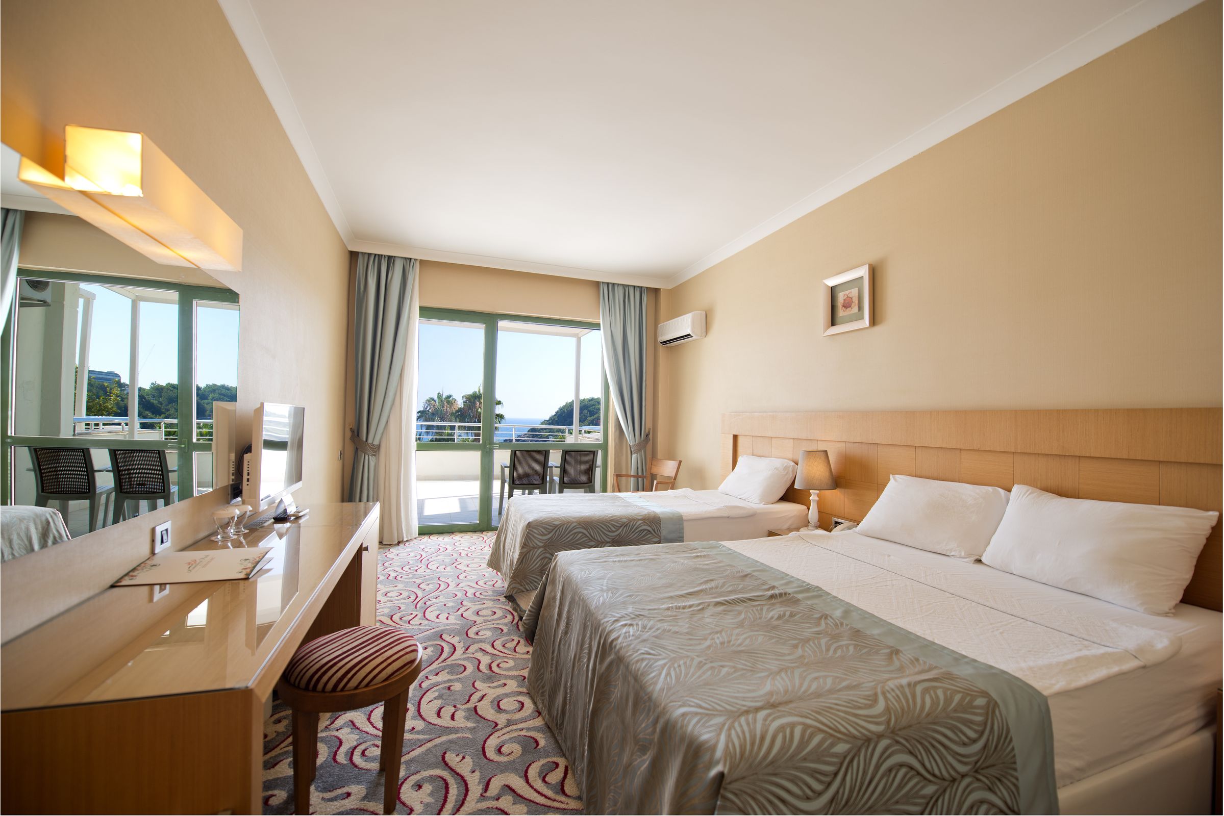 Hotel raspolaže sa 350 soba. Posjeduje 283 standardne sobe (površine 30 m2, za najviše 2+1 pax), 50 family soba (površine 35m2, 2+2 pax, dve spavaće sobe povezane harmonika vratima), 17 jacuzzi soba (površine 30 m2, za najviše 2+1 pax, sa jacuzzijem na terasi). Sve sobe su moderno dekorisane i imaju kupatilo sa kadom ili tuš kabinom, fen, centralnu klimu, direktnu telefonsku liniju, mini bar (bezalkoholna pića i voda se svakodnevno dopunjuju), sef, LCD SAT TV i muzičke kanale, WiFi internet, tepih, balkon ili terasu.