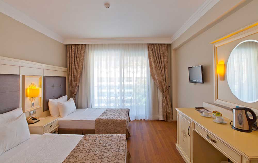 Hotel sadrži recepciju, loby bar, 2 restorana, 5 barova, 5 otvorenih bazena, pool bar, dečiji bazen, noćni klub, mini dečiji klub, fitness i spa centar, besplatan internet i parking u okviru hotela.Hotel u totalu poseduje 320 soba koje su podeljene u 5 blokova i koje poseduju terasu, klima uređaj, sef, mini bar, set za pripremu kafe/čaja, telefon, LCD TV, TWC, fen za kosu, svakodnevno čišćenje soba