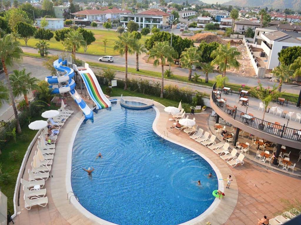 Sadržaji hotela: recepcija, glavni restoran, bar pored bazena i na plaži, otvoreni bazeni za decu i odrasle, tobogani, fitnes, sauna, tursko kupatilo, odbojka na plaži, stoni tenis, animatorski program, mini klub, igralište za decu, bežični internet (besplatan u lobiju).