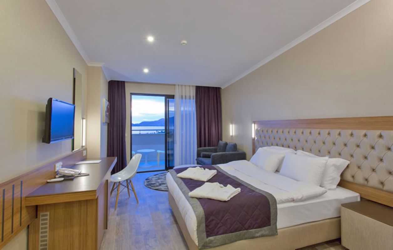 Hotel ima ukupno 195 soba. Standard sobe (površine 22m2, francuski ležaj ili 2 odvojena ležaja + sofa na razvlačenje sa pogledom na park ili more, za najviše 3 osobe; ), suite sobe (površine 35m2, za najviše 4 pax) i sobe namenjene osobama sa posebnim potrebama. Svaka soba ima kupatilo sa tuš kabinom, fen za sušenje kose, električni čajnik, sef, klima uređaj, LCD SAT TV, telefon, mini bar i balkon.
