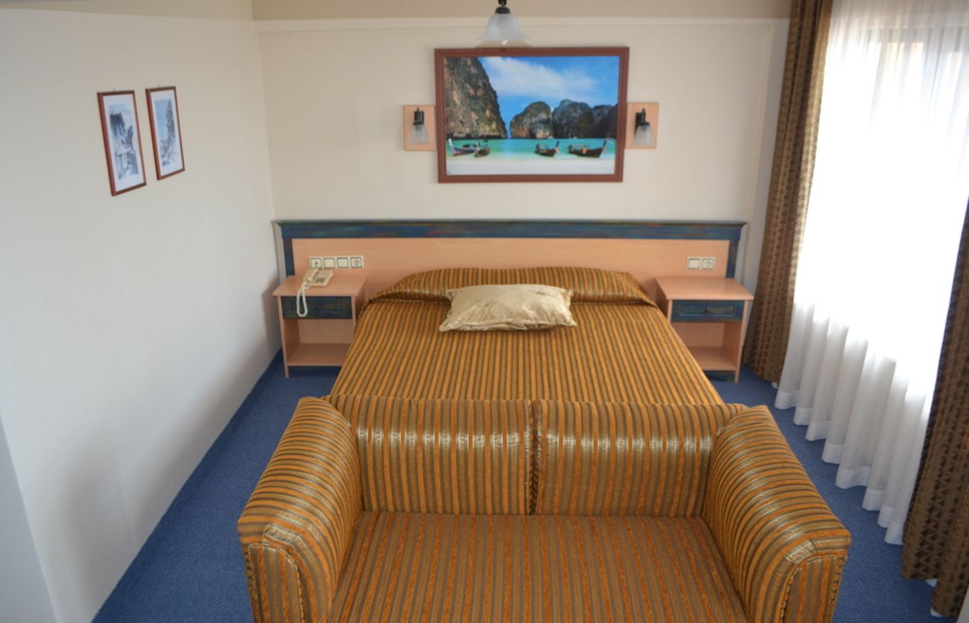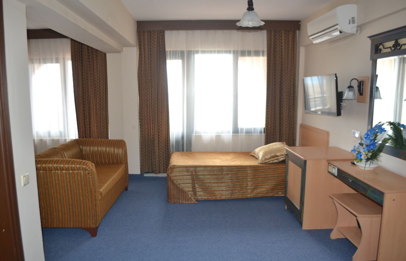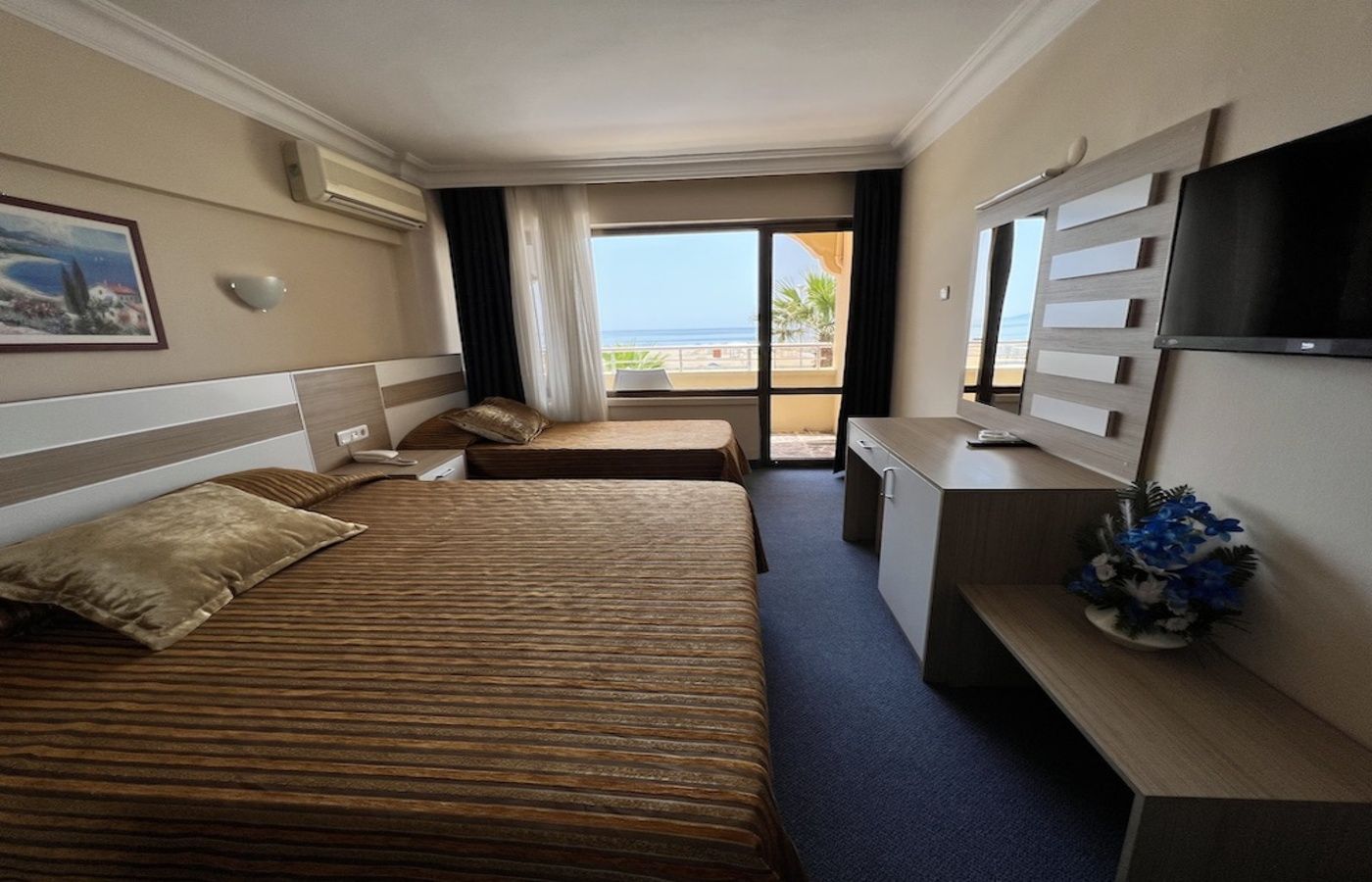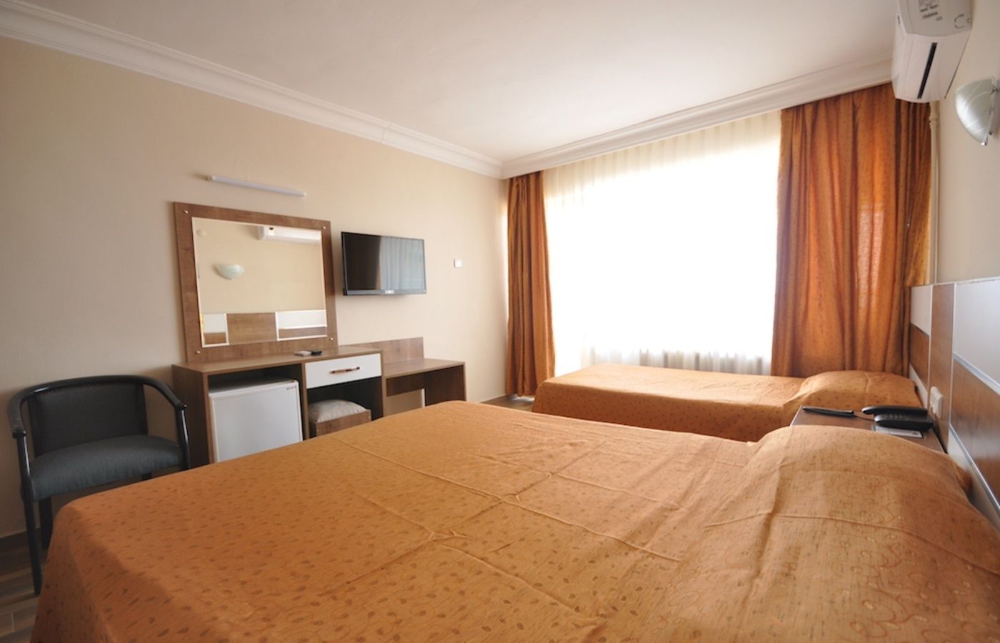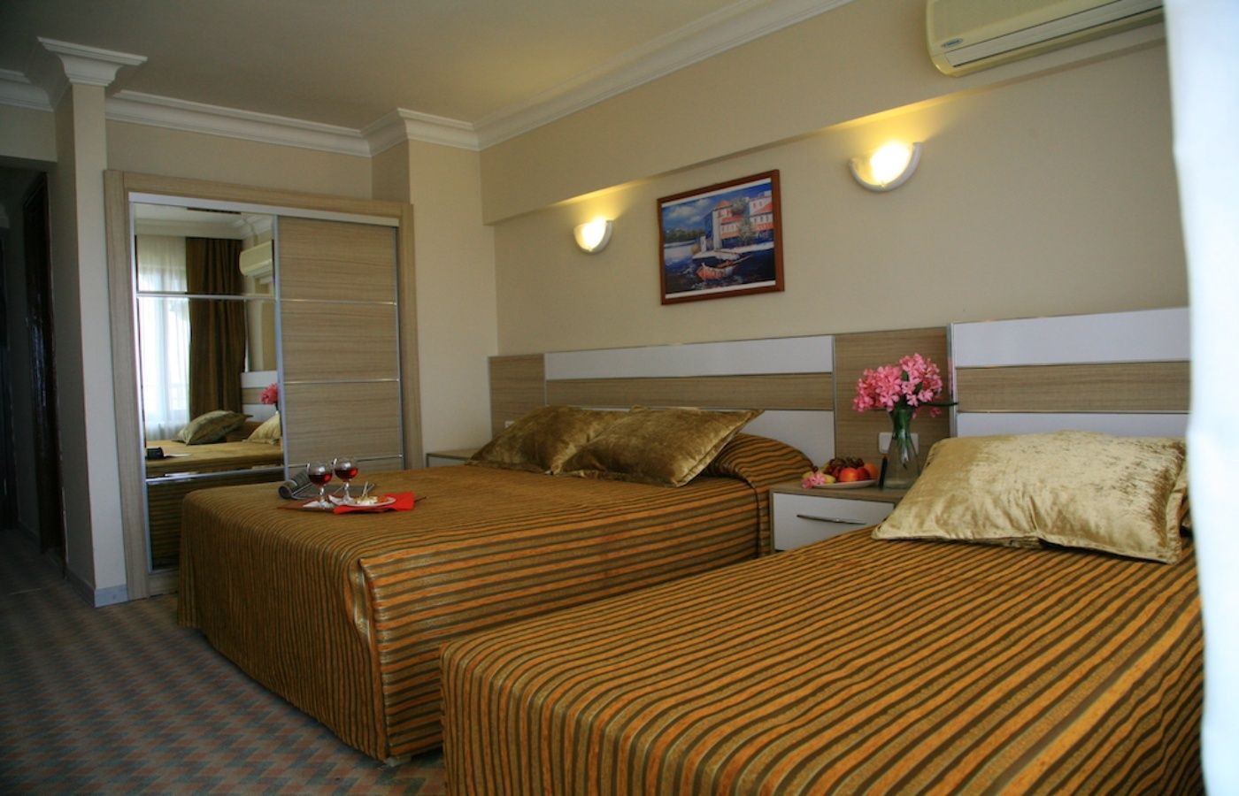 Sadržaj i tipovi soba: Sobe su komforne i opremljene su tako da svaka ima balkon, TWC, klima uređaj (uračunat u cenu) TV, fen za kosu. Dvokrevetne sobe su sa francuskim i jednim single krevetom,površine 22m². Trokrevetne poseduju standardnu opremu, sa jednim francuskim i jednim singl krevetom, površine 30m². Family room su komfornije i pružaju prijatan boravak za porodice. Hotel broji oko 90 soba.