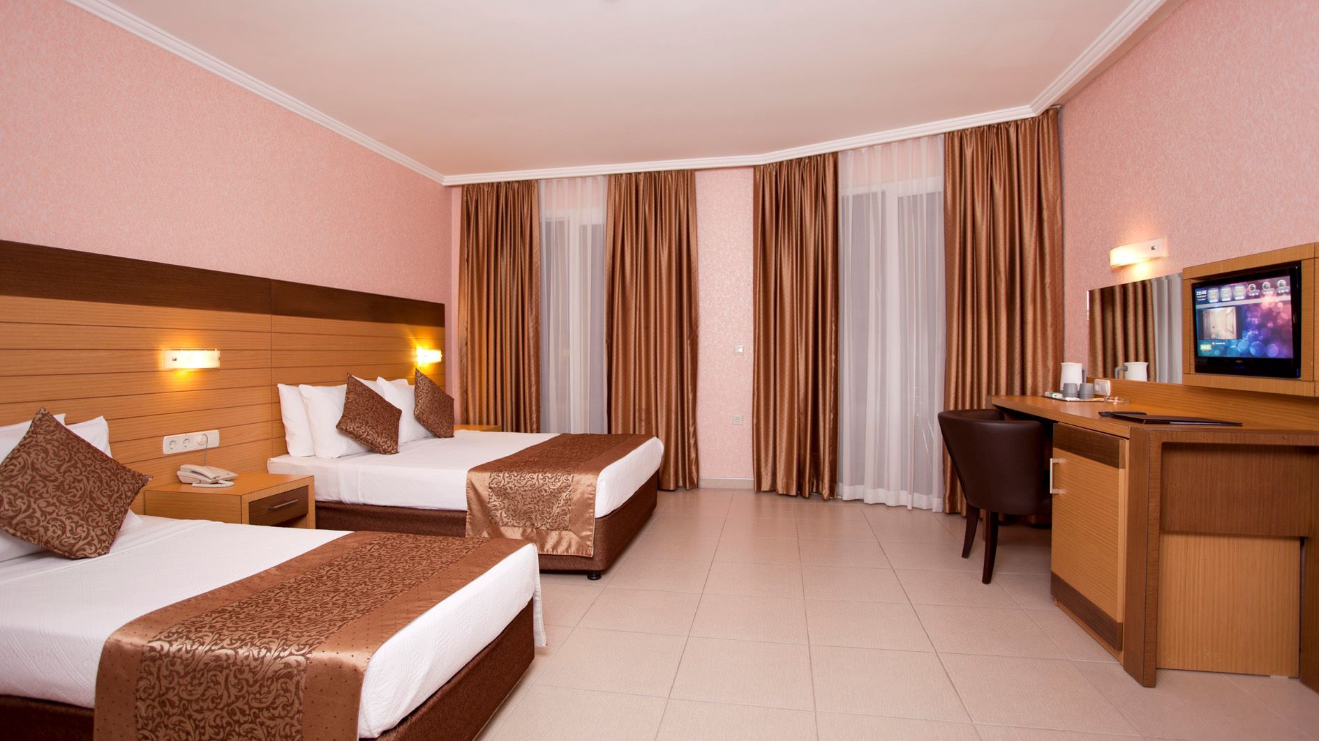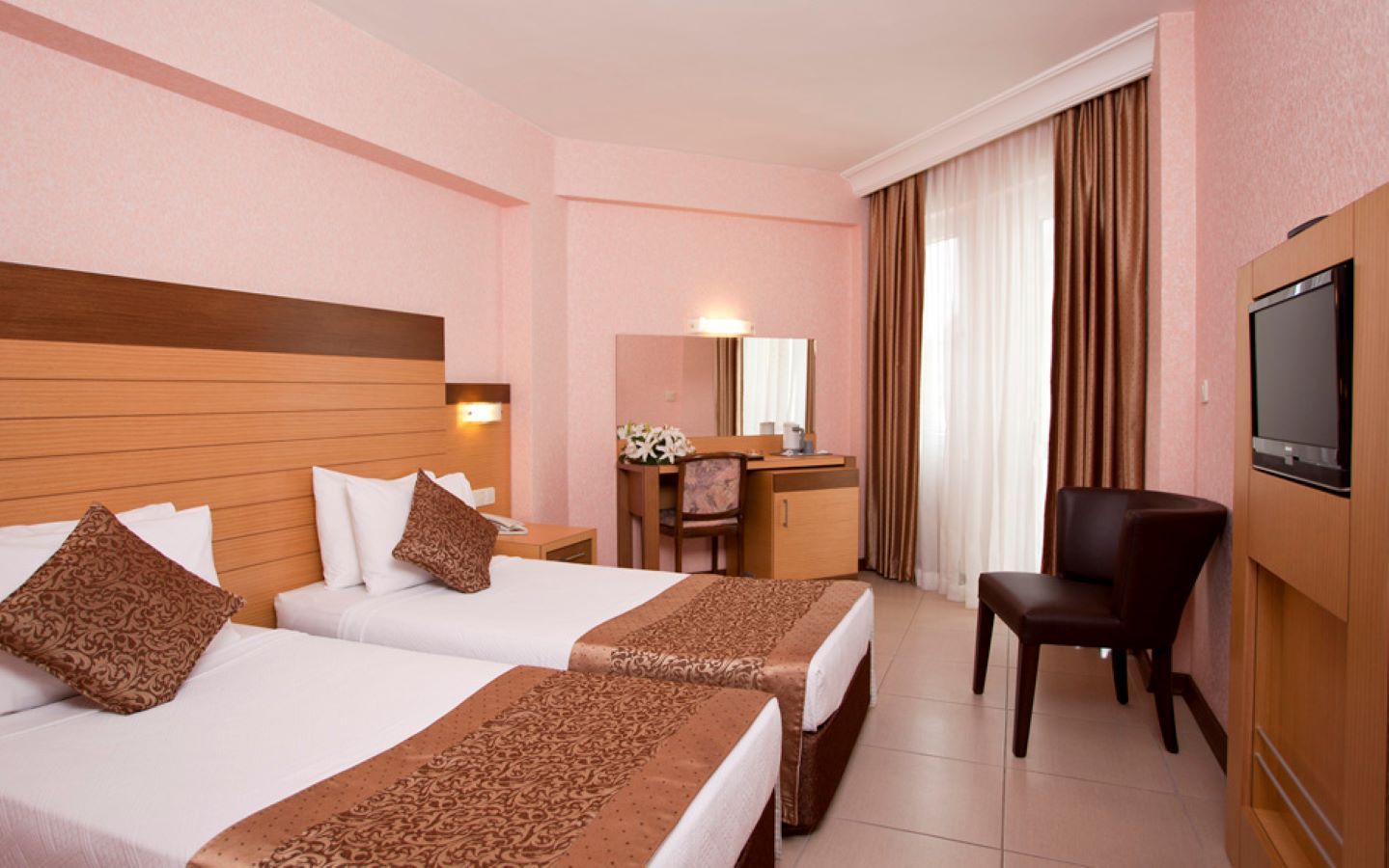 SMEŠTAJ: Hotel ima ukupno 82 sobe. Standardne sobe (jedna spavaća soba, jedno kupatilo, max. 2+1 pax). Sve sobe imaju privatno kupatilo sa tuš kabinom, fen, klima, direktna telefonska linija, mini bar (dodatno se naplaćuje), sef (dodatno se naplaćuje), satelitska TV i muzički kanali, keramički pod i balkon.