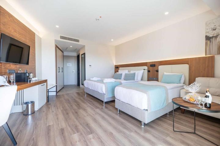 Hotel ima ukupno 325 soba. Standardne sobe (31m², jedna spavaća soba s francuskim krevetom + jedan single krevet + pomoćni ležaj, jedno kupatilo, max. 3 osobe + 1 dete), Standardna soba sa jacuzzijem (31 m², spavaća soba s francuskim krevetom + jedan single krevet, jedno kupatilo, jacuzzi i ljuljačka na balkonu, max. 2 + 1 osoba), Soba sa direktnim pristupom bazenu (36 m², spavaća soba s francuskim krevetom + jedan single krevet, jedno kupatilo, direktan pristup zajedničkom bazenu, max. 2 osobe), Superior sobe (38 m², jedna spavaća soba sa francuskim krevetom + jedan single krevet + pomoćni ležaj, max. 3 osobe + 1 dete), Porodične sobe (39 m², dve spavaće sobe sa vratima između, jedna spavaća soba sa francuskim krevetom, druga sa dva single kreveta, jedno kupatilo, max. 4 osobe + dete). Sve sobe imaju privatno kupatilo sa tušem i fenom za kosu, papuče, centralni klima uređaj koji radi u određenim satima prema vremenskim uvjetima, telefon s direktnom linijom, mini bar (voda, bezalkoholna pića koja se svakodnevno dopunjuju), kuhalo, set za pripremu čaja i kafe, sef, laminat na podu, satelitsku TV i muzički kanal, WI-FI internet i balkon.