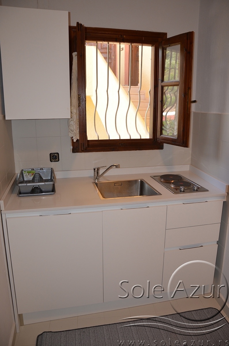 DVOKREVETNI STUDIJI: Dvokrevetni studiji se sastoje iz prostorije u kojoj se nalaze dva singl standardna ležaja dimenzija 90x190cm, dva noćna stočića, ormar, dve lampe, TV, klima uređaj, Kuhinja se nalazi u sklopu studija i od opreme poseduje rešo sa dve ringle, sudoperu, kao i neophodan kuhinjski pribor za dve osobe. Kupatilo u svom sastavu ima tuš kabinu , kao i po jedan veliki i jedan mali peškir po gostu. Terasa je komforna, i poseduje sto sa dve stolice. Usluga WI-FI internet konekcije je besplatna.