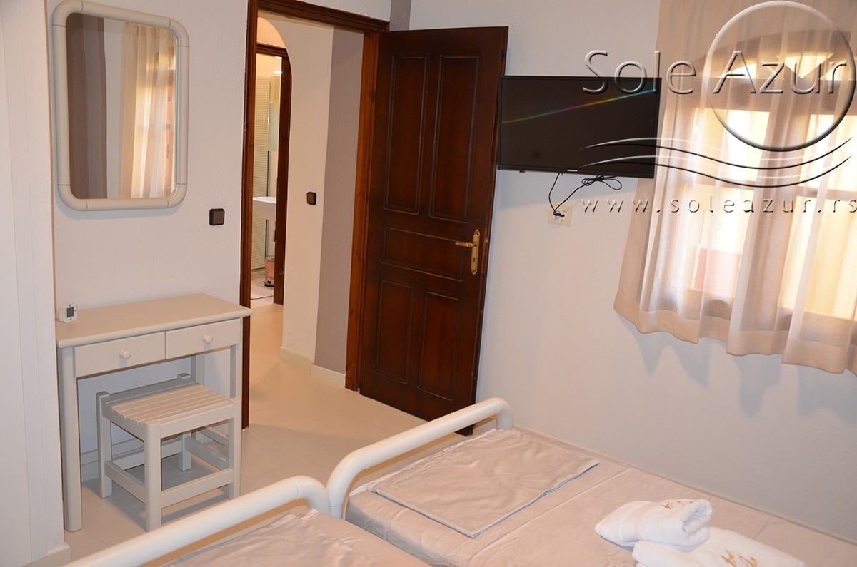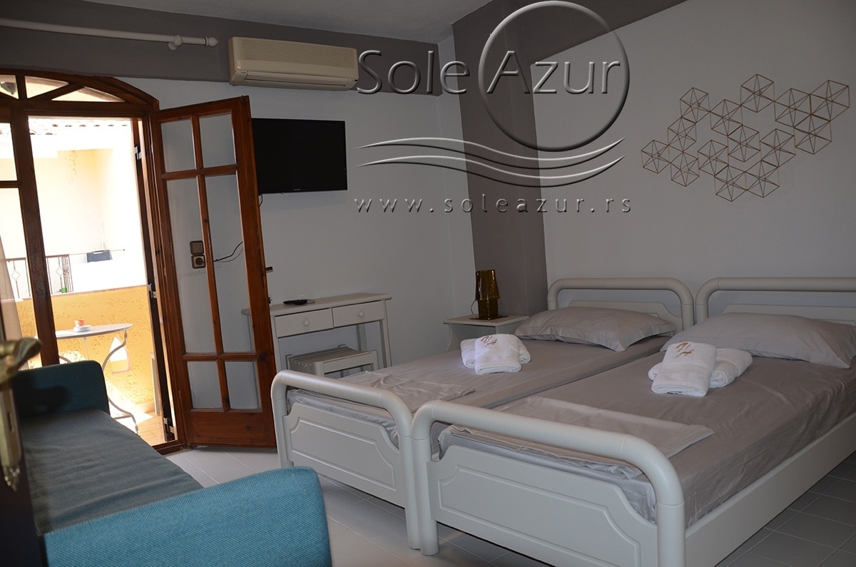 TROKREVETNI APARTMAN: Trokrevetni apartman se sastoji iz spavaće sobe koja u svom sastavu poseduje dva singl ležaja dimenzija 90x190cm kao sofa krevet dimenzija 190x80cm (takođe u pojedinim apartmanima treći ležaj može biti u sklopu kuhinjskog dela, dok se onda u spavaćoj sobi mogu nalaziti 2 singl lezaja), dva noćna stočića sa dve lampe, klima uređaj, TV, i ima izlaz na terasu, koja poseduje sto sa tri stolice. Druga prostorija je kuhinja sa trpezarijom u kojoj se nalaze sto sa tri stolice za ručavanje, dok je u sastavu kuhinje rešo sa dve ringle, kao i neophodno posuđe za tri osobe. Kupatilo se sastoji od tuš kabine manjih dimenzija. Usluga WI-FI internet konekcije je besplatna.