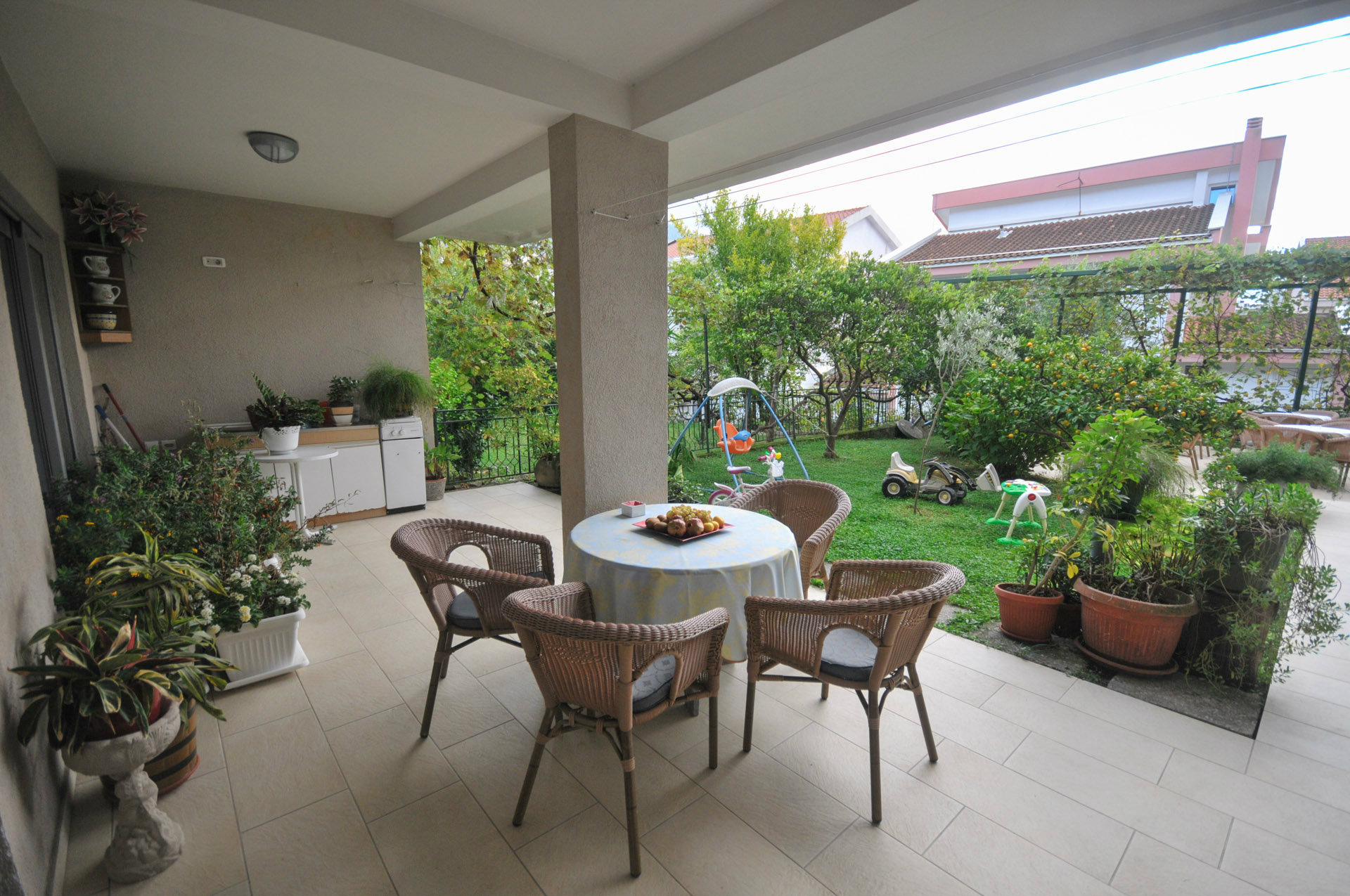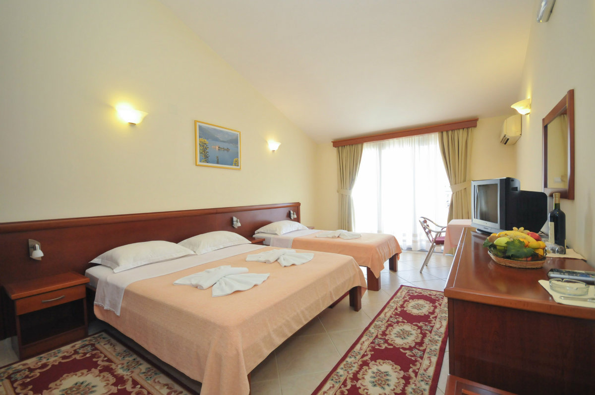 Četvorokrevetni apartman: Broj osoba: 4, Broj kreveta: 2 bračna. Odovojene spavaće sobe, terasa, parking, klima uredjaj, grijanje, TV, peškiri, bezični pristup internetu, šporet, frižider, opremljena kuhinja