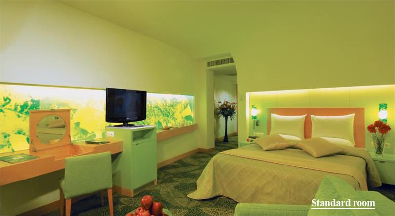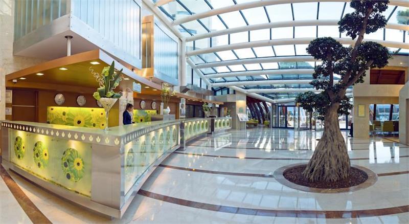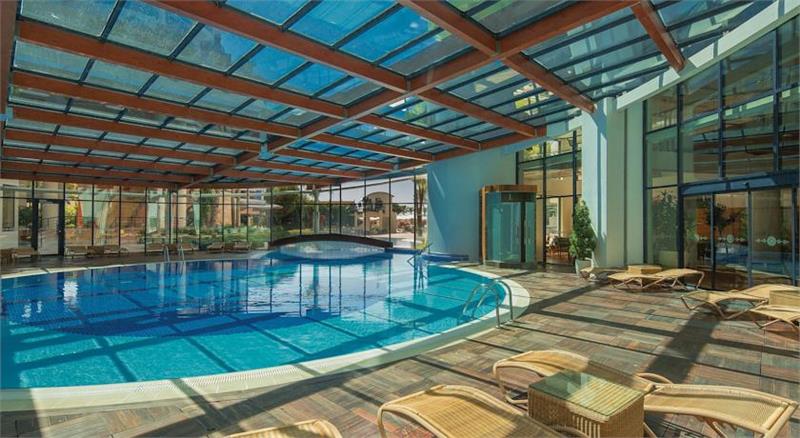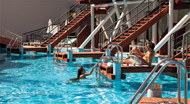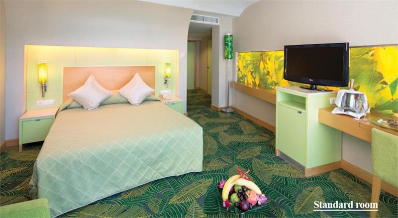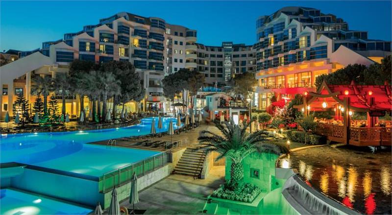 Sadržaj hotela: Hotel poseduje glavni restoran, 5 a la carte restorana (italijanski, mediteranski, azijski, turski i francuski), 8 barova, dijetetski i vegetarijanski meni, 6 spoljašnjih bazena, unutrašnji bazen, 4 vodena tobogana, spa centar, menjačnicu, parking, rent a car, konferencijske sale, tursko kupatilo, saunu, parno kupatilo, jacuzzi, teretanu, aerobik, akvabik, odbojku na plaži, mini fudbal, košarku, stoni tenis, pikado, jedrenje, katamaran, animaciju, diskoteku, 3 teniska terena, dečiji meni, 3 dečija bazena, dečije igralište, dečiji vodeni tobogan, mini klub.