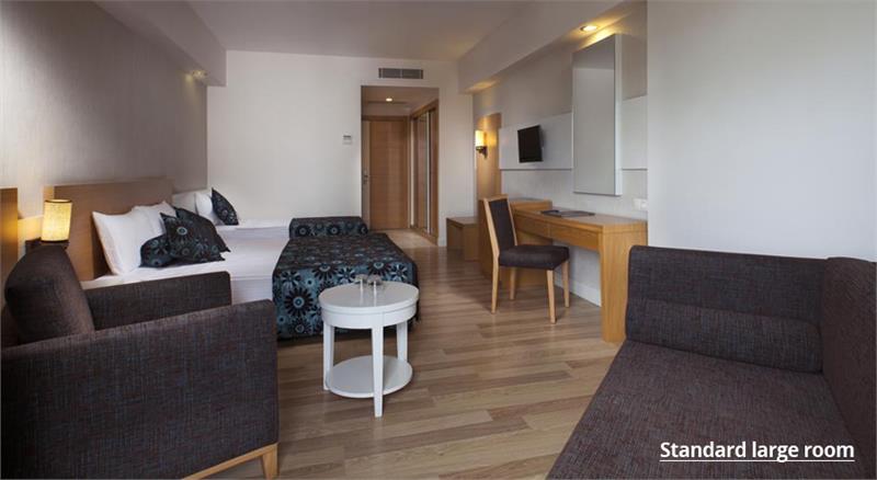Sve sobe imaju kupatilo sa kadom ili tuš kabinom,fen, mini bar (voda i sokovi samo po dolasku,posle se dopunjava samo sa vodom), klimu,telefon,sef (uz doplatu), SAT TV, balkon ili terasu U ponudi su: -Standard sobe -Standard large sobe -Porodične sobe **Wi-fi je dostpan samo u lobiju