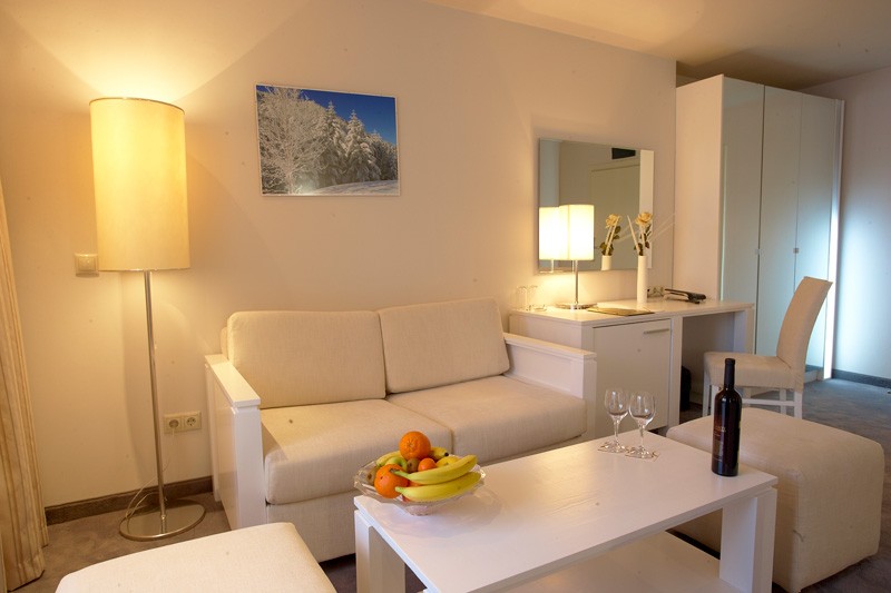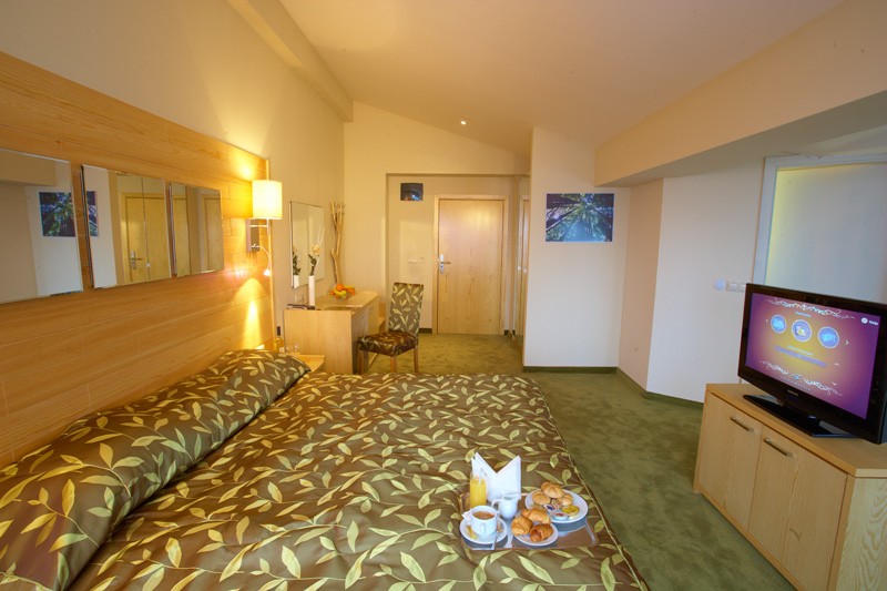 - Junior Suite za 2-4 osobe (25 m2): soba veće kvadrature sa francuskim ležajem i sofa na razvlačenje za dve odrasle osobe i/ili dvoje dece.