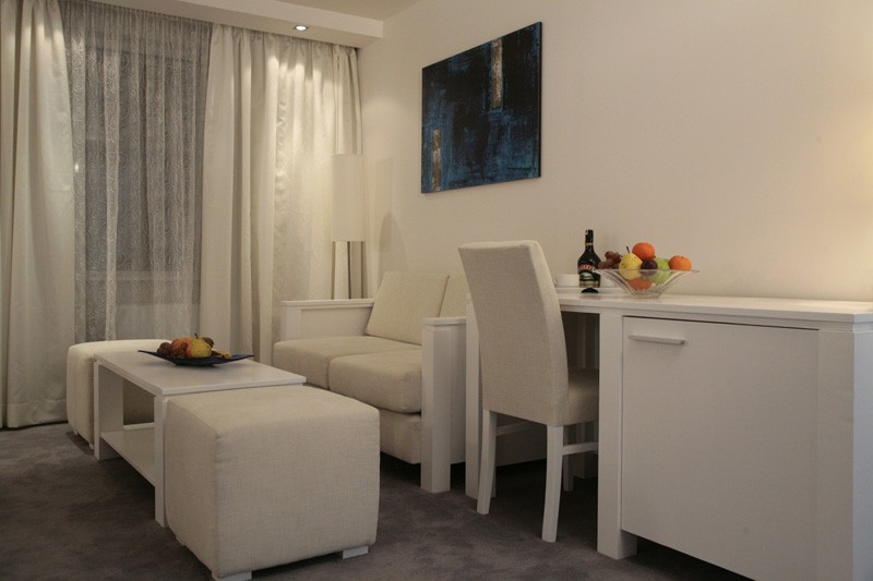 - Jednosobni apartman za 2-4 osobe: spavaća soba sa francuskim ležajem, dnevni boravak sa sofom na razvlačenje (nema vrata) za dve odrasle osobe i/ili dvoje dece.