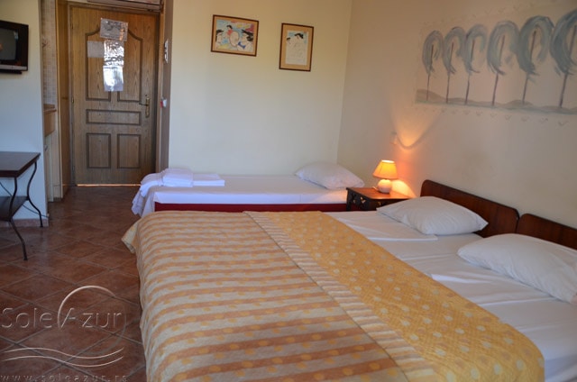 1/3+1 SOBA: koja u svom sastavu ima jedan francuski ležaj veličine 190x160cm, jedan singl standardni ležaj veličine 190x90cm, i foteljom na razvlačenje, koja kada se razvuče ima dimenzije 185x85cm. Klima uređaj (uključen u cenu) TV, ketler, kupatilo sa tuš/wc, fen za kosu i terasa sa setom od stola sa četiri stolice. Soba poseduje po dva peškira po osobi.