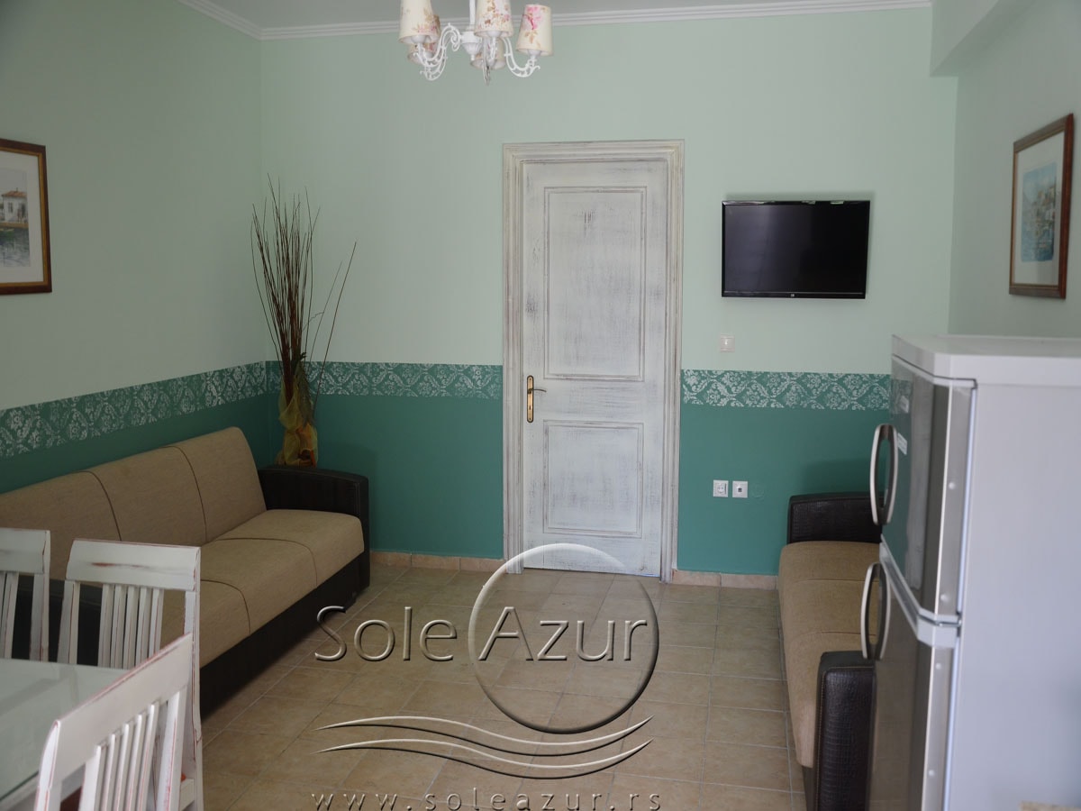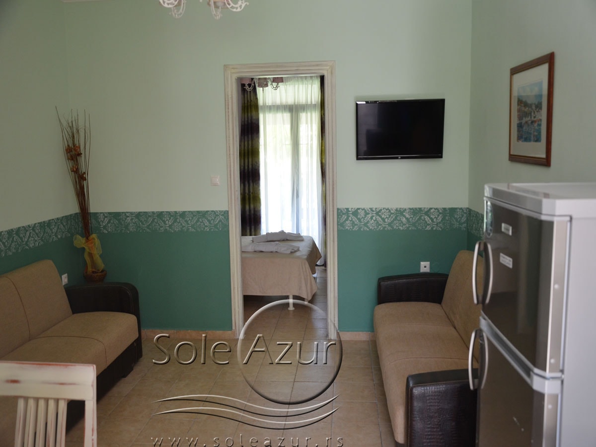ČETVOROKREVETNI APARTMAN: se nalazi u delu blizu drugog velikog bazena i dečijeg bazena, kao i blizu igrališta za decu. Takođe, tu je i veliki nadkriveni parking. U neposrednoj blizini je i sala za doručak. Apartmani su izuzetno prostrani. Sastoje se od dve prostorije koje su odvojene vratima. Ulazi se u izuzetno prostran dnevni boravak sa kuhinjom. Tu se nalaze dva ležaja na razvlačenje svaki dimenzija (100X180cm), TV, klima uređaj, trpezarijski sto za ručavanje sa četiri stolice. Kuhinja je velika, prostrana i sastoji se od šporeta sa ravnom pločom sa četiri ringle i rernom za pečenje, frižider sa posebnom komorom za zamrzavanje, aspirator i pribor za ručavanje za četiri osobe. U nastavku se ulazi u spavaću sobu koja u svom sastavu ima Francuski ležaj dimenzija (140X200cm), ormar, sef klima uređaj, TV, noćni stočić sa ogledalom, dva mala stočića pored kreveta. Iz spavaće sobe se izlazi na prostranu terasu, koja je opremljena stolom sa četiri stolice. Kupatilo se nalazi u prvom delu apartmana i u njega se ulazi iz dnevnog boravka. Kupatilo poseduje tuš kabinu i fen za kosu. Izvrsni apartmani, jako prostrani. Preporuka za porodice sa decom ili društvo.