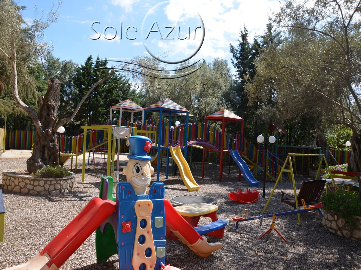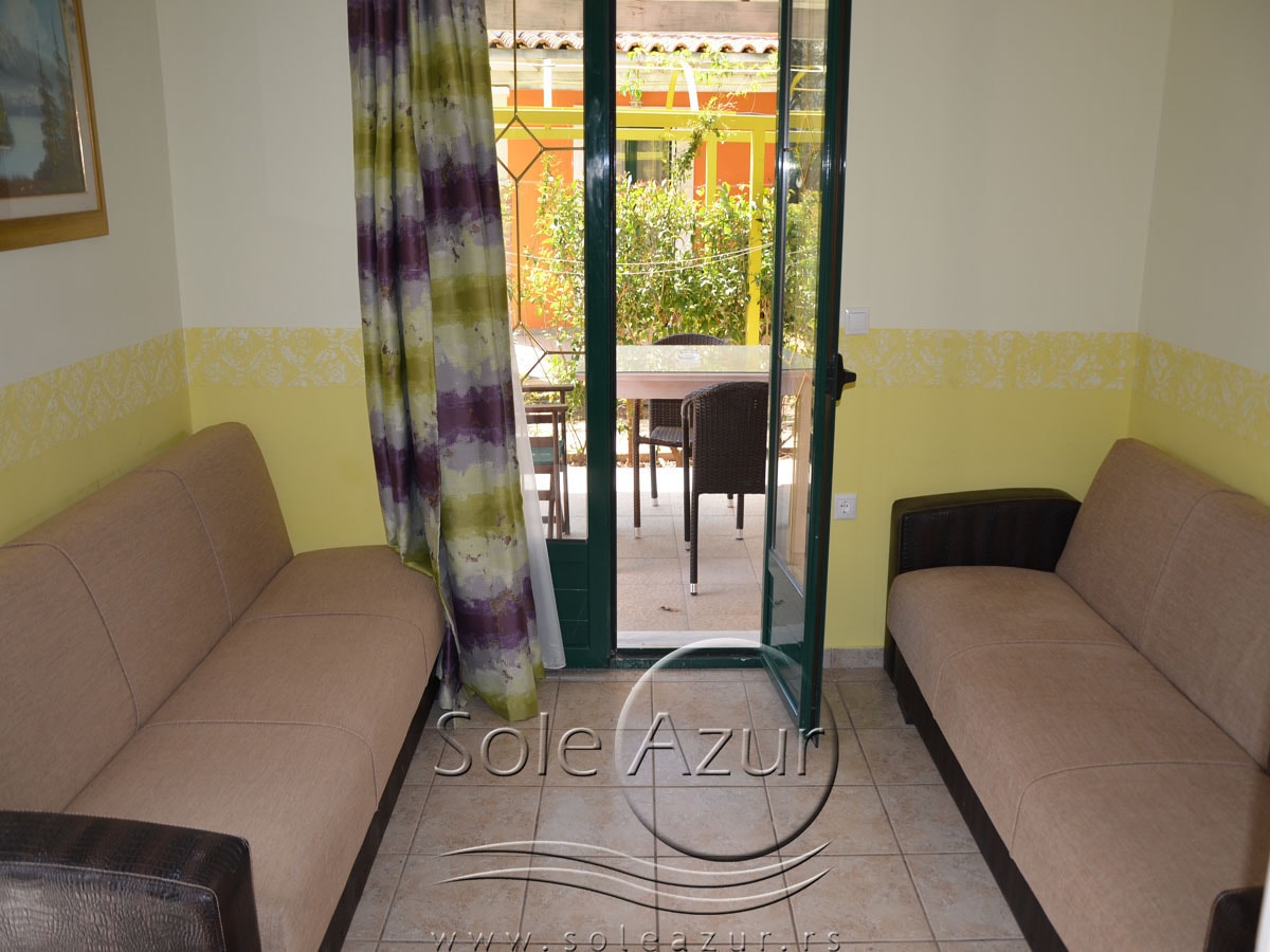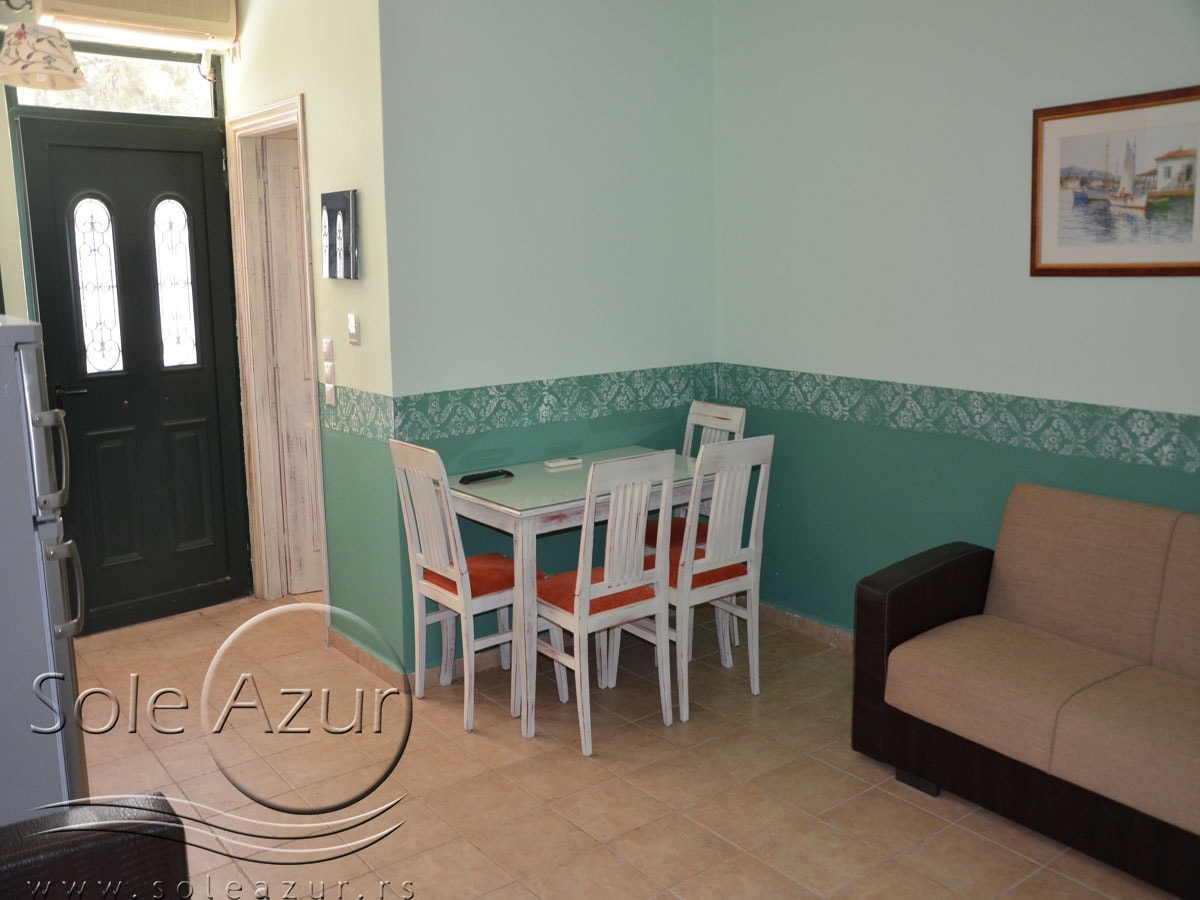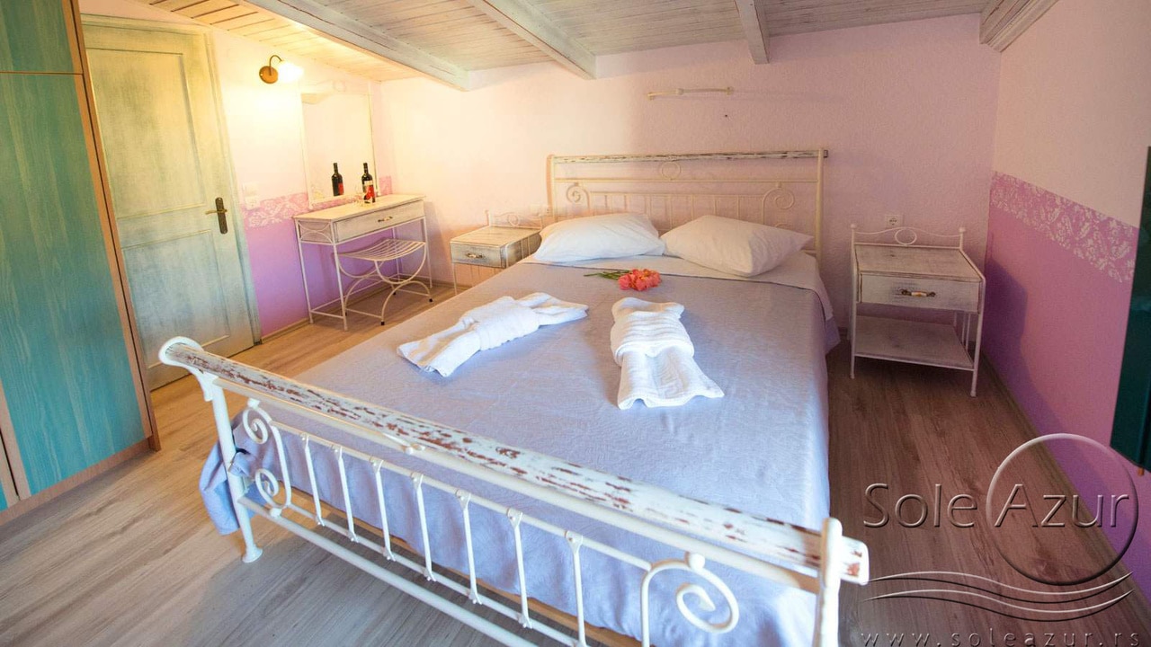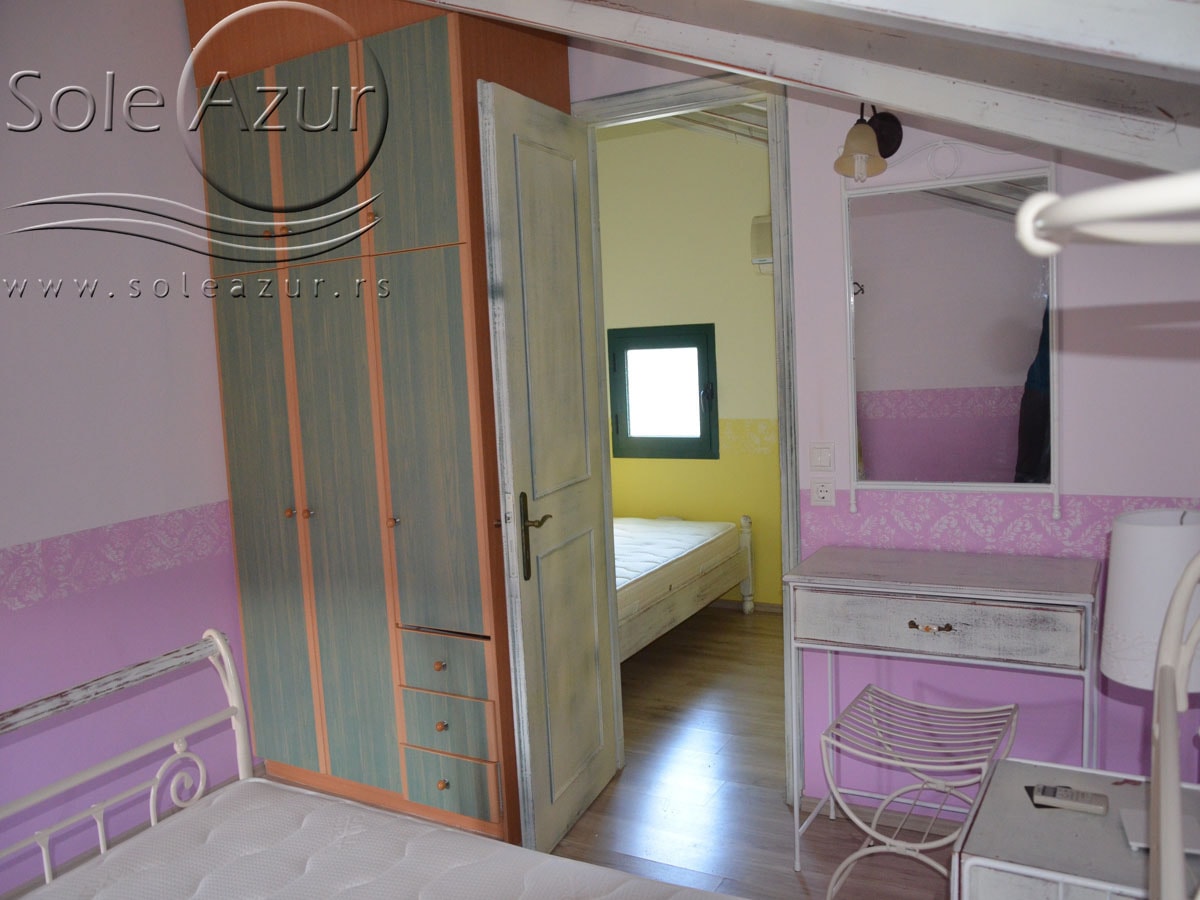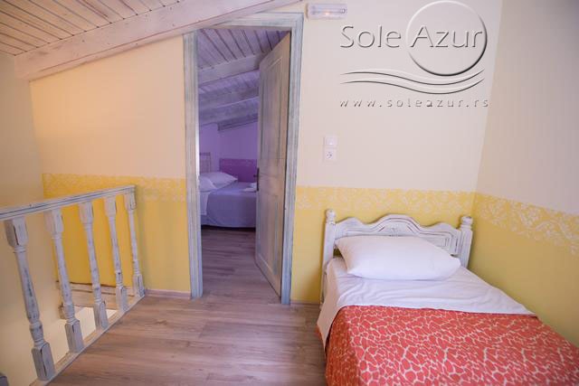 PETOKREVETNA MEZONETA: Između dva velika i dečijeg bazena na idealnoj lokaciji u kompleksu, nalazi se petokrevetna mezoneta. Velika zasebna kuća u svom sastavu ima dve mezonete koje su u potpunosti odvojene i svaka ima svoj zaseban ulaz i svoju potpunu privatnost. Ograđena je sa puno zelenila i prelepog cveća. Ulazi se u prostoriju u kojoj se nalazi dnevni boravak i kuhinja. U dnevnom boravku se nalaze dva kreveta na razvlačenje svaki dimenzija (100X180cm), ormar, TV. Kuhinja u svom sastavu poseduje šporet sa četiri ringle, frižider sa posebnom komorom za zamrzavanje, aspirator i pribor za ručavanje za pet osoba. Kupatilo se takođe nalazi na donjem nivou i poseduje malu kadu sa zavesom, kao i fen za kosu. Iz dnevnog boravka se izlazi na terasu koja je opremljena stolom sa pet stolica. Iz dnevnog boravka se stepenicama penje na gornji nivo. U otvorenom delu se nalazi jedan sing ležaj dimenzija (80X180cm), klima uređaj i prozor. Odatle se nastavlja u zasebnu spavaću sobu, koja u svom sastavu ima Francuski ležaj dimenzija (140X200cm), ormar u kome se nalazi sef, noćni stočić sa ogledalom, kao i dva mala stočića pored kreveta. Mezoneta je idealna za porodice sa više dece, kao i za omanje društvo koje želi da bude zajedno.