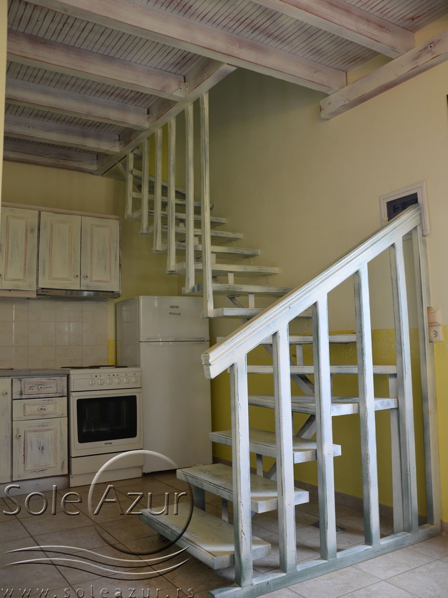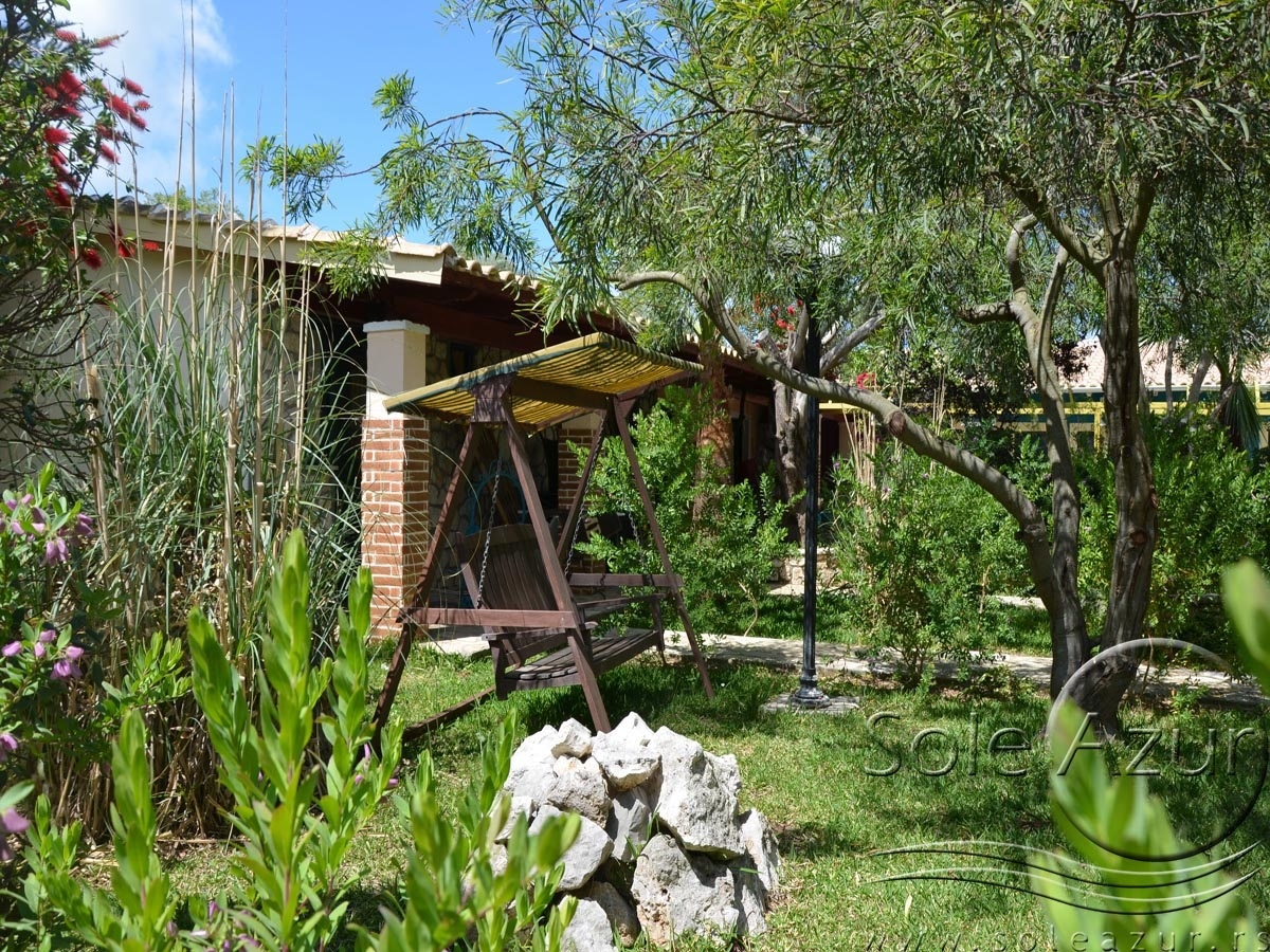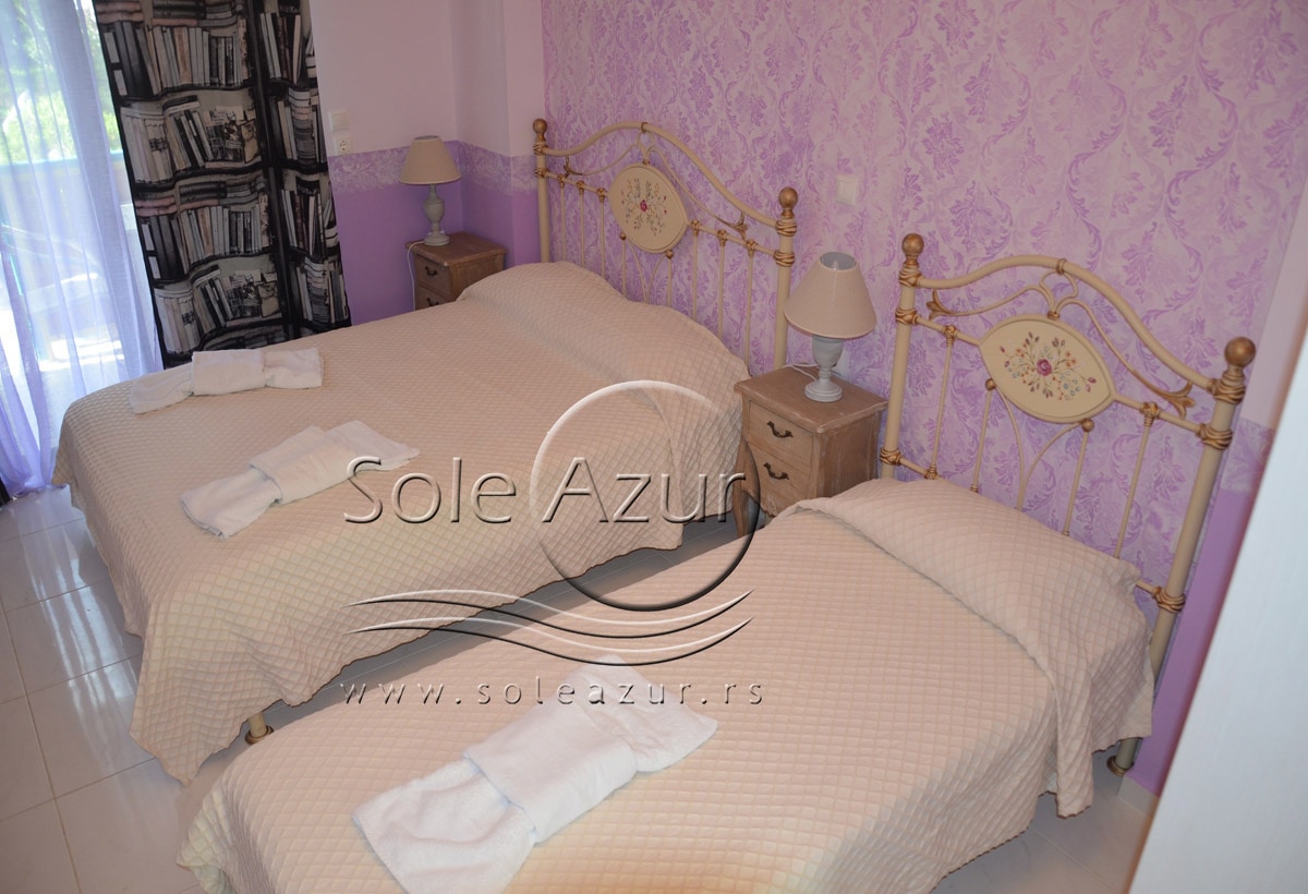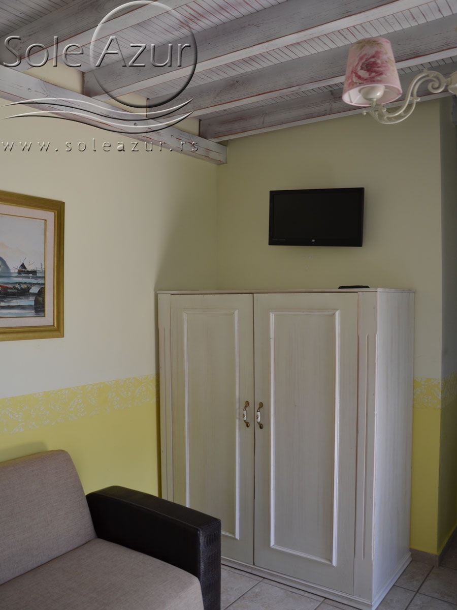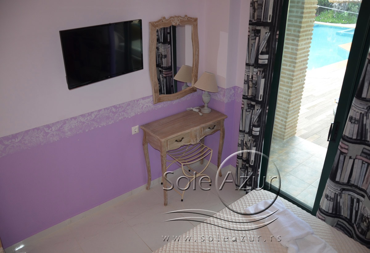 PETOKREVETNA MEZONETA: Između dva velika i dečijeg bazena na idealnoj lokaciji u kompleksu, nalazi se petokrevetna mezoneta. Velika zasebna kuća u svom sastavu ima dve mezonete koje su u potpunosti odvojene i svaka ima svoj zaseban ulaz i svoju potpunu privatnost. Ograđena je sa puno zelenila i prelepog cveća. Ulazi se u prostoriju u kojoj se nalazi dnevni boravak i kuhinja. U dnevnom boravku se nalaze dva kreveta na razvlačenje svaki dimenzija (100X180cm), ormar, TV. Kuhinja u svom sastavu poseduje šporet sa četiri ringle, frižider sa posebnom komorom za zamrzavanje, aspirator i pribor za ručavanje za pet osoba. Kupatilo se takođe nalazi na donjem nivou i poseduje malu kadu sa zavesom, kao i fen za kosu. Iz dnevnog boravka se izlazi na terasu koja je opremljena stolom sa pet stolica. Iz dnevnog boravka se stepenicama penje na gornji nivo. U otvorenom delu se nalazi jedan sing ležaj dimenzija (80X180cm), klima uređaj i prozor. Odatle se nastavlja u zasebnu spavaću sobu, koja u svom sastavu ima Francuski ležaj dimenzija (140X200cm), ormar u kome se nalazi sef, noćni stočić sa ogledalom, kao i dva mala stočića pored kreveta. Mezoneta je idealna za porodice sa više dece, kao i za omanje društvo koje želi da bude zajedno.