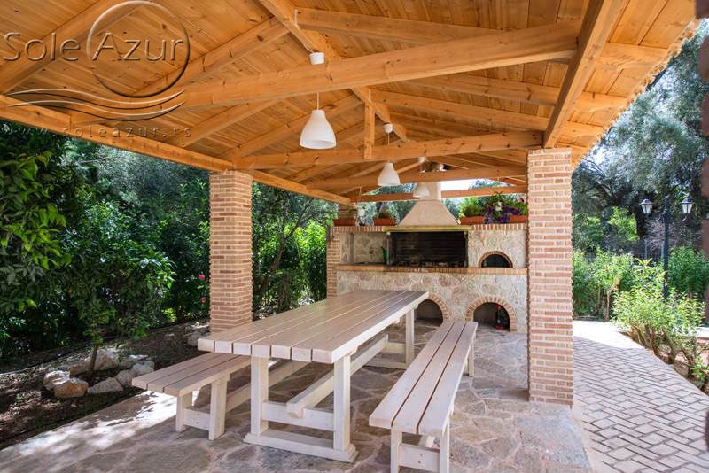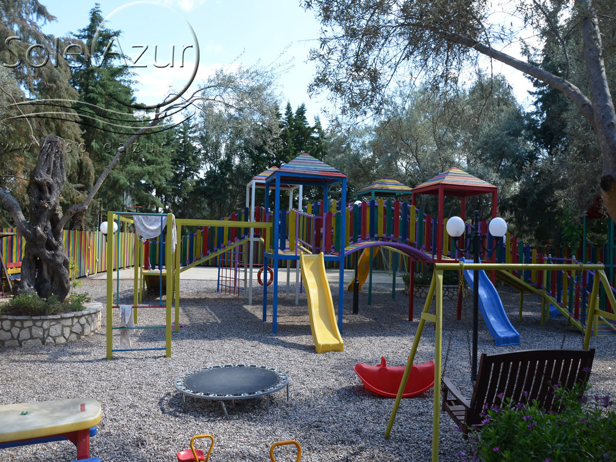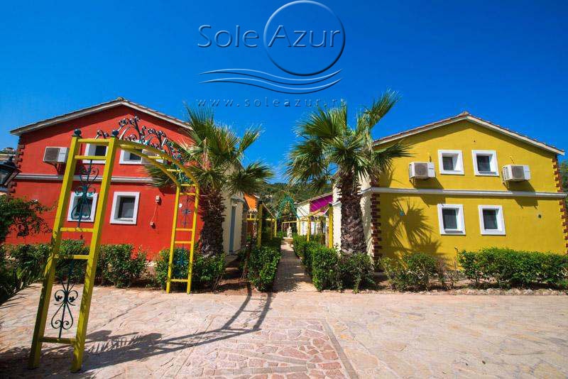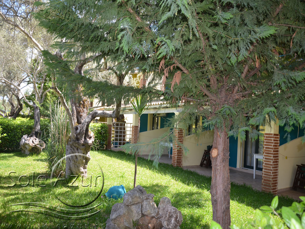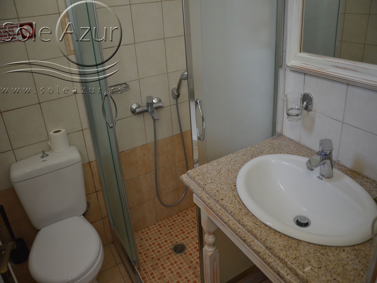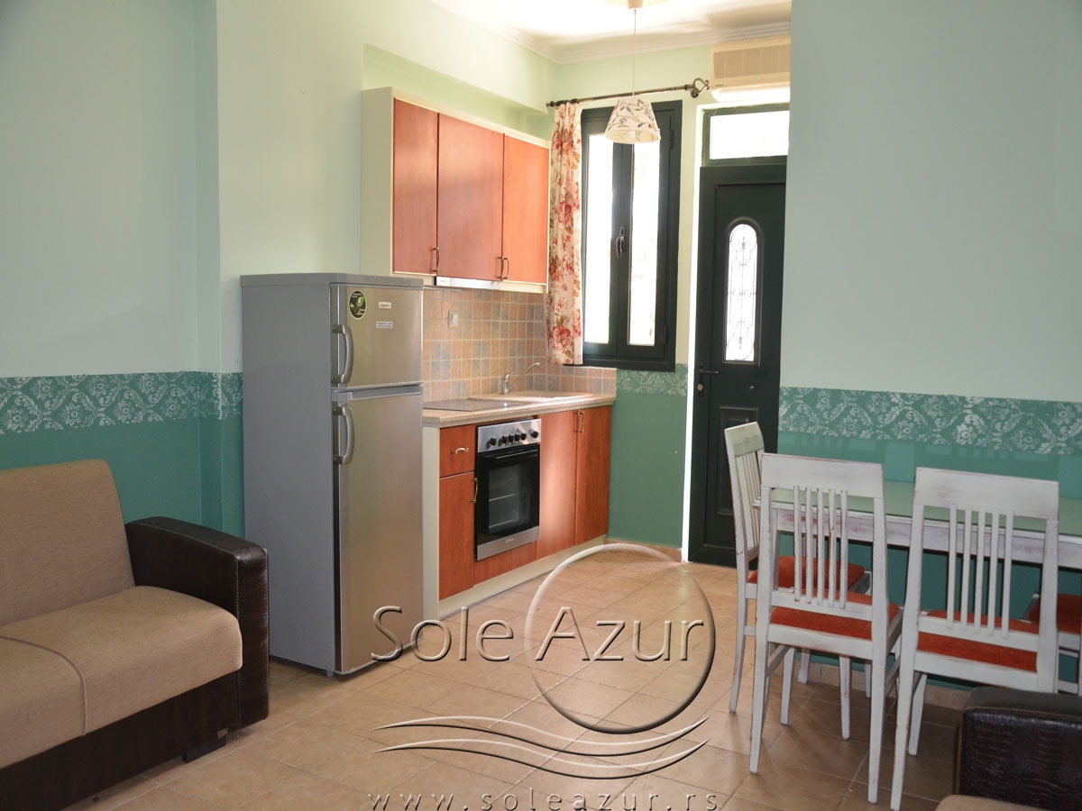 PETOKREVETNA MEZONETA: Između dva velika i dečijeg bazena na idealnoj lokaciji u kompleksu, nalazi se petokrevetna mezoneta. Velika zasebna kuća u svom sastavu ima dve mezonete koje su u potpunosti odvojene i svaka ima svoj zaseban ulaz i svoju potpunu privatnost. Ograđena je sa puno zelenila i prelepog cveća. Ulazi se u prostoriju u kojoj se nalazi dnevni boravak i kuhinja. U dnevnom boravku se nalaze dva kreveta na razvlačenje svaki dimenzija (100X180cm), ormar, TV. Kuhinja u svom sastavu poseduje šporet sa četiri ringle, frižider sa posebnom komorom za zamrzavanje, aspirator i pribor za ručavanje za pet osoba. Kupatilo se takođe nalazi na donjem nivou i poseduje malu kadu sa zavesom, kao i fen za kosu. Iz dnevnog boravka se izlazi na terasu koja je opremljena stolom sa pet stolica. Iz dnevnog boravka se stepenicama penje na gornji nivo. U otvorenom delu se nalazi jedan sing ležaj dimenzija (80X180cm), klima uređaj i prozor. Odatle se nastavlja u zasebnu spavaću sobu, koja u svom sastavu ima Francuski ležaj dimenzija (140X200cm), ormar u kome se nalazi sef, noćni stočić sa ogledalom, kao i dva mala stočića pored kreveta. Mezoneta je idealna za porodice sa više dece, kao i za omanje društvo koje želi da bude zajedno.