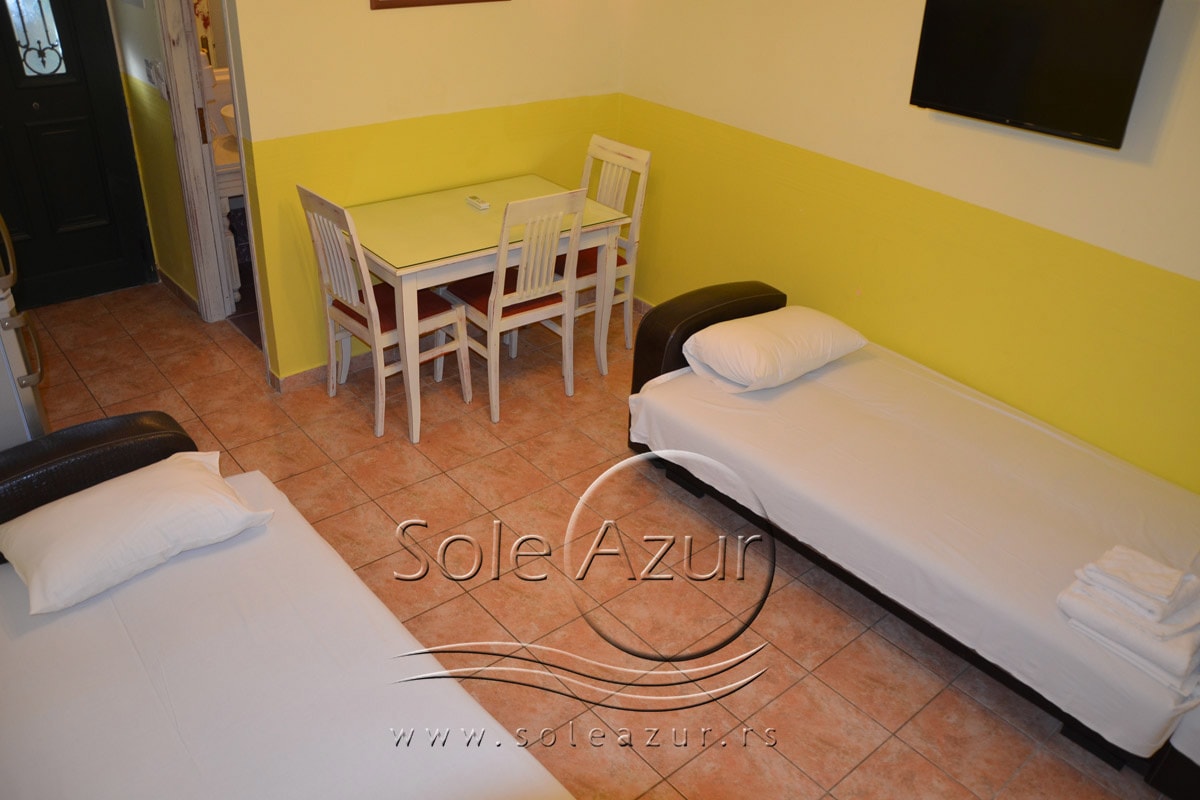 Dvoje dece do 7 godina u pratnji dve punoplatežne osobe u trokrevetnom studiju, mogu da koriste jedan zajednički ležaj i plaćaju po 50% cene smeštaja.