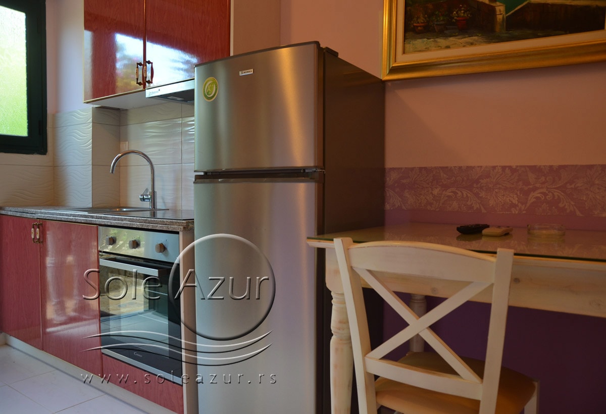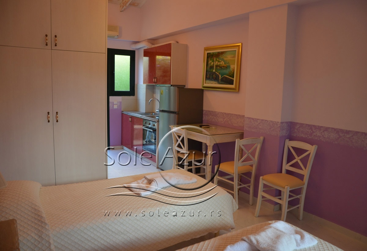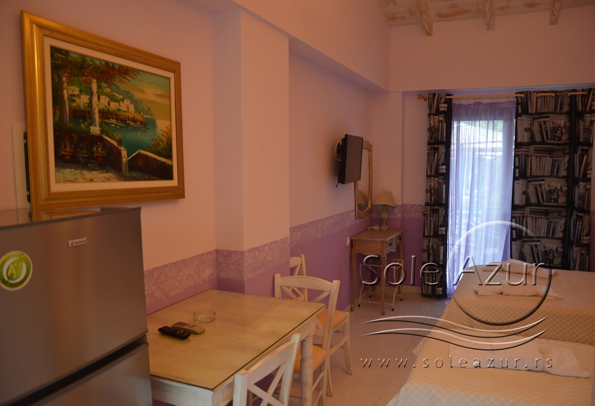 DVO/TROKREVETNI STUDIJI: Na ulazu u kompleks Apart/Hotela Villagio Maistro nalazi se zaseban kompleks bungalova prelepo sređenih koji primaju svaki 2-3 osobe. U sredini ovog dela kompleksa se nalazi veliki bazen. Ovaj deo kompleksa je predviđen za smeštaj parova ili prijatelja koji su odvojeni od porodica sa više dece koji se nalaze u drugom delu kompleksa, tako da Vam pruža mir i privatnost. Oko bazena se nalaze ležaljke kao i ljuljaška za odmor i sunčanje. Bungalovi su napravljeni tako da imaju svaki svoj zaseban ulaz. Ograđeni balkon koji se nalazi ispred ulaza Vam pruža mogućnost odmora sa pogledom na bazen. Ulazi se u prostoriju koja ima jedan Francuski ležaj i jedan standardni singl ležaj. Pored toga, bungalov poseduje TV, Klima uređaj, kao i noćni stočić. U nastavku se nalazi opremljena kuhinja sa priborom za ručavanje za dve/tri osobe, velikim šporetom sa četiri ringle i rernom za pečenje, frižiderom i aspiratorom. Kupatilo u svom sastavu poseduje tuš kabinu. Izvrstan, novo sagrađeni deo kompleksa je idealan za odmor i relaksaciju.