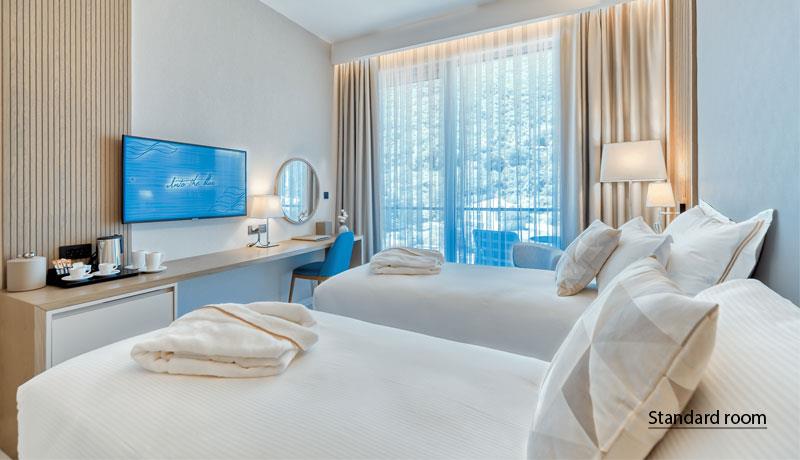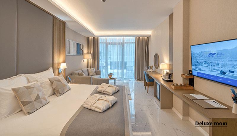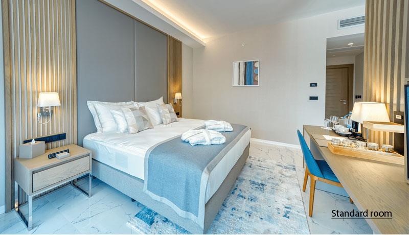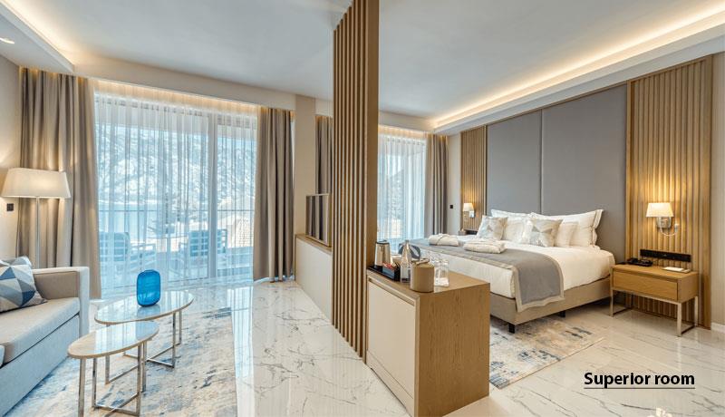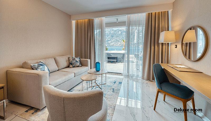 Smeštaj: Hotel Blue Kotor Bay se sastoji od 106 soba (standard,superior,deluxe sobe). Sve sobe imaju francuski ležaj ili dva zasebna ležaja i svaka ima terasu ili balkon sa garniturom za sedenje.