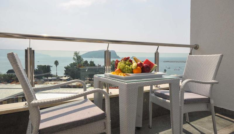 Porodični apartman pogled more - Površina 60-75m2. Dve spojene sobe. Francuski ležaj + fotelja, toaletni stocic sa stolicom, balkon, cajna kuhinja sa trpezarijskim stolom i stolicama. Francuski ležaj + fotelja, toaletni stocic sa stolicom, balkon. Maksimalni kapacitet 4 osobe. Klima,