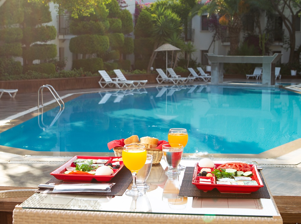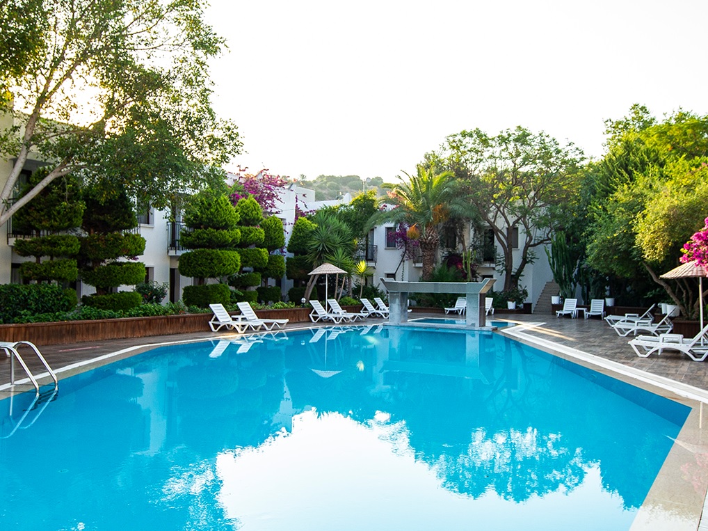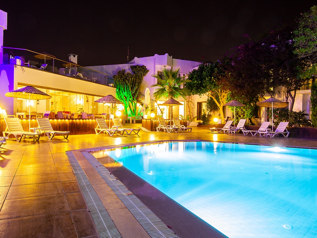 Hotel Club Flora, Bodrum (Turska) - Nalazi se samo 100 metara od plaže u zalivu Gumbet, 2 km od centra Bodruma, odmah ispod belih kupolastih kišnih cisterni po kojima je zaliv dobio ime. Čak i po zagušljivoj letnjoj vrućini, hladan povetarac koji struji sa Bosfora ka obali i moru koje se polako produbljuje sa obale, su razlozi zbog kojih je plaža Gumbet odličan izbor.
