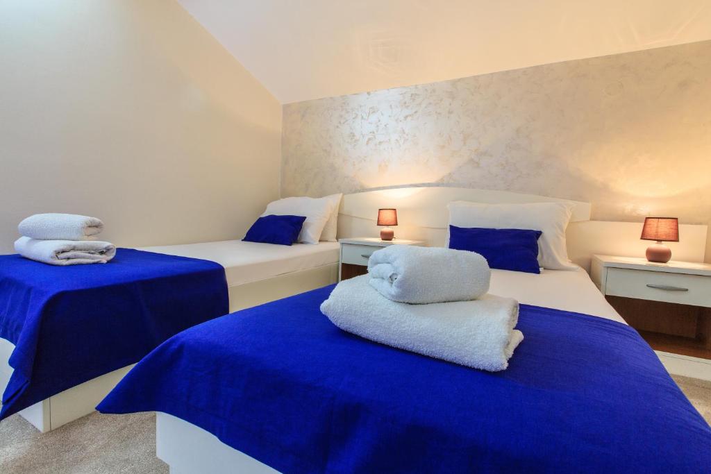 - Trokrevetna soba - Klimatizovana trokrevetna soba 25 m2, predviđena za 3 osobe. Poseduje balkon sa kojeg se pruža pogled na more. Sadržaj sobe: klima-uređaj, fen za kosu, balkon, frižider, pogled na more.