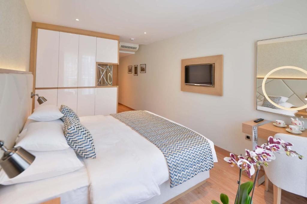 Smeštajne jedinice su elegantno uređene i uključuju namešten balkon, klima-uređaj, mini-bar i besplatan internet. Iz većine soba pruža se panoramski pogled na more.
