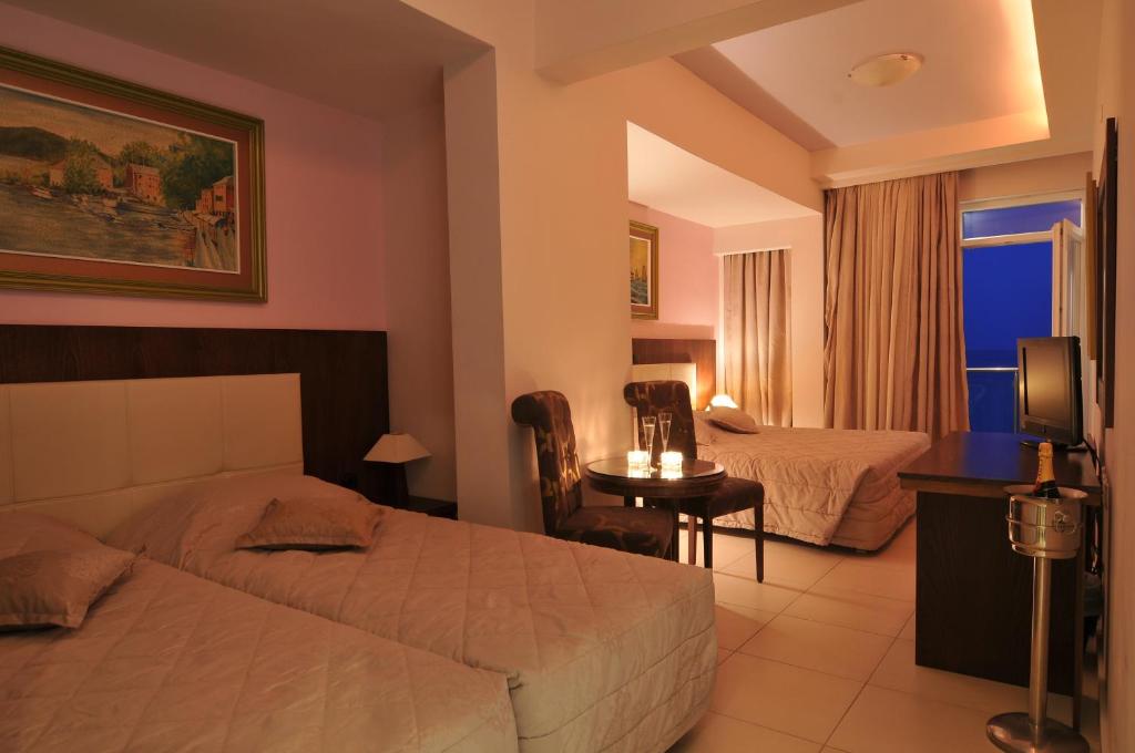 Sadržaj hotela: Single Rooms & Double Rooms (~18-22 m2), Triple Rooms (~29 m2), Junior Suites Road View/Sea View (~30 m2), Quadruples & Quadruples connect. door (~30 m2). Recepcija, bar, restoran, internet..
