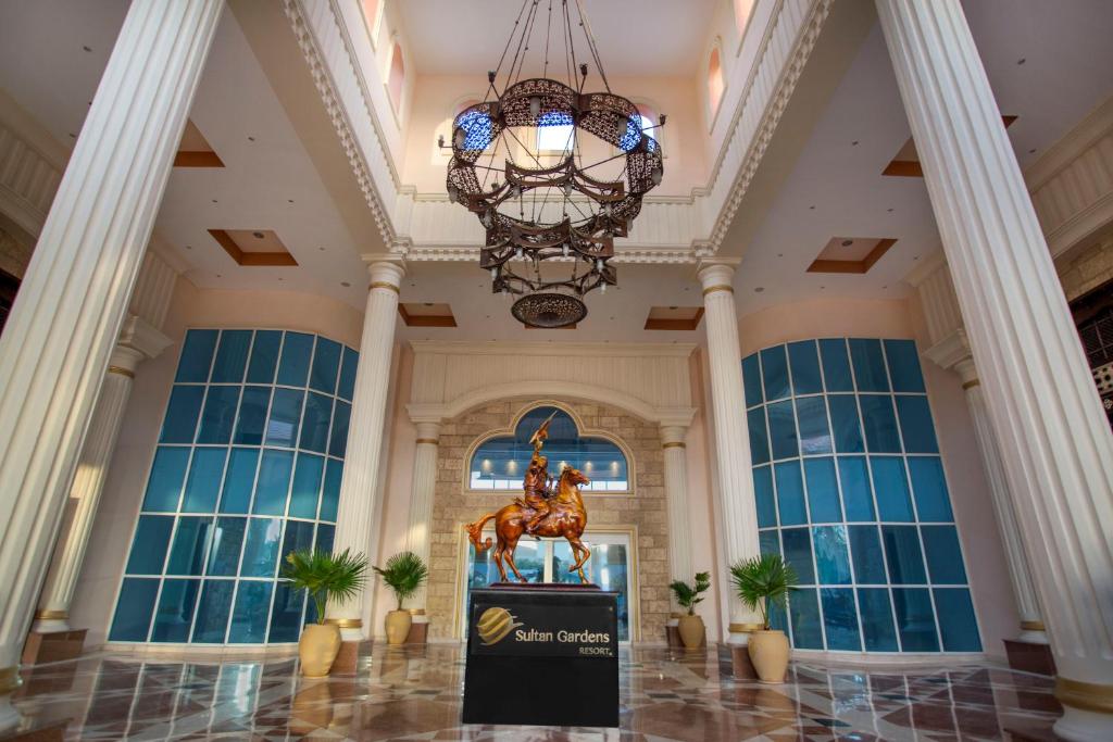 Lokacija: Prostran hotelski kompleks Sultan Gardens Resort se prostire na 150.000 m2, okružen negovanim vrtom, nalazi se na samoj obali sa pogledom na ostrvo Tiran, u zoni Shark’s Bay, nedaleko od popularnog turističkog centra SOHO. Udaljen je 6 km od aerodroma, 7 km od mesta Nama Bej. Ima veoma lepu, uređenu, peščanu plažu koja je podeljena na dva dela, Relaxive side i Active Side. Shark’s Bay je oblast poznata po kristalno čistom moru, idealnom za snorkling, ronjenje i ostale sportove na vodi ali je priobalje većinom pokriveno koralima pa su postavljeni pontoni da bi se lakše došlo do korala.