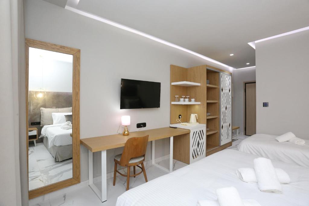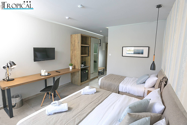 Sadržaj soba: Sve sobe imaju TWC sa fenom, mali frižider, SAT TV, sef (uz doplatu na licu mesta), A/C, krevetac (na upit bez doplate) i terasu.