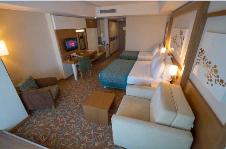 Sobe: Hotel poseduje ukupno 340 soba, od toga 262 standardne sobe, 36 velikih soba, 40 porodičnih soba, 2 sobe za hendikepirane. Porodične sobe se sastoje od dve spavaće sobe. Svaka soba poseduje: fen za sušenje kose, televizor sa satelitskim kanalima, telefon, Wi-Fi internet, klima uređaj i balkon.
