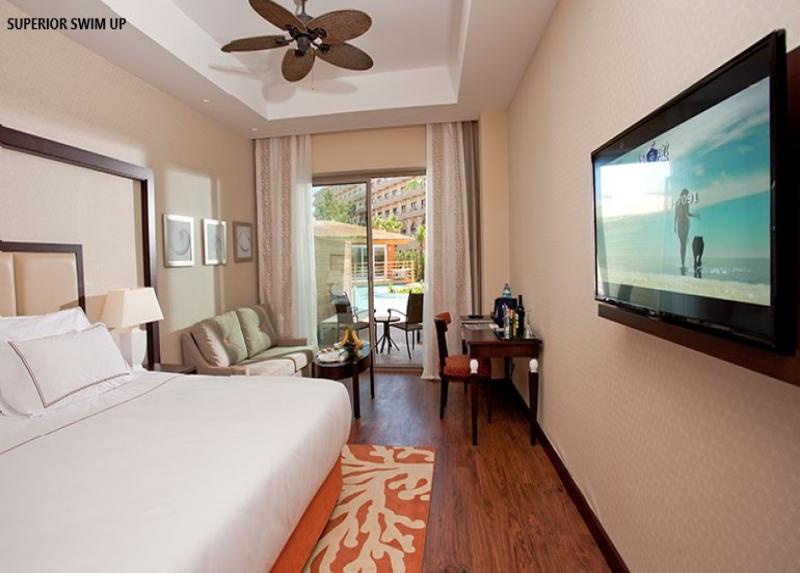 - Swim up superior soba: površine 39m2 ,sastoji se od jedne prostorije sa delom za sedenje i sofom na razvlačenje (francuski ležaj) ima pogled na bazen i terasu sa direktnim izlaskom na zajednički bazen. Od ostalih sadržaja: klima, sef, mini bar dopunjuje se jednom dnevno (voda, sokovi,pivo, vino), ketler, LCD TV sa satelitskim i muzičkim kanalima, telefon, kupatilo sa tuš kabinom ili kadom, fen, papuče, bademantil, Wi-Fi, meni jastuka.
