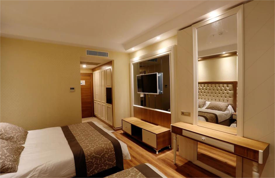 Hotel ima ukupno 303 sobe. Standardne sobe (25 m2, jedna spavaća soba sa francuskim ležajem + jedan single krevet, jedno kupatilo, max. 2+1 pax), Economy sobe (22 m2, jedna spavaća soba, jedno kupatilo, bez balkona, max. 2 pax), Porodične sobe (45 m2, dve odvojene spavaće sobe, jedno kupatilo, max. 3+1 pax). Sve sobe imaju privatno kupatilo sa tuš kabinom, fen, centralnu klimu koja radi u skladu sa vremenskim uslovima, direktan telefon, mini bar (voda se dopunjava svakodnevno), sef, satelitski TV i muzički kanali, laminat na podu, balkon, Wi-Fi internet konekciju.