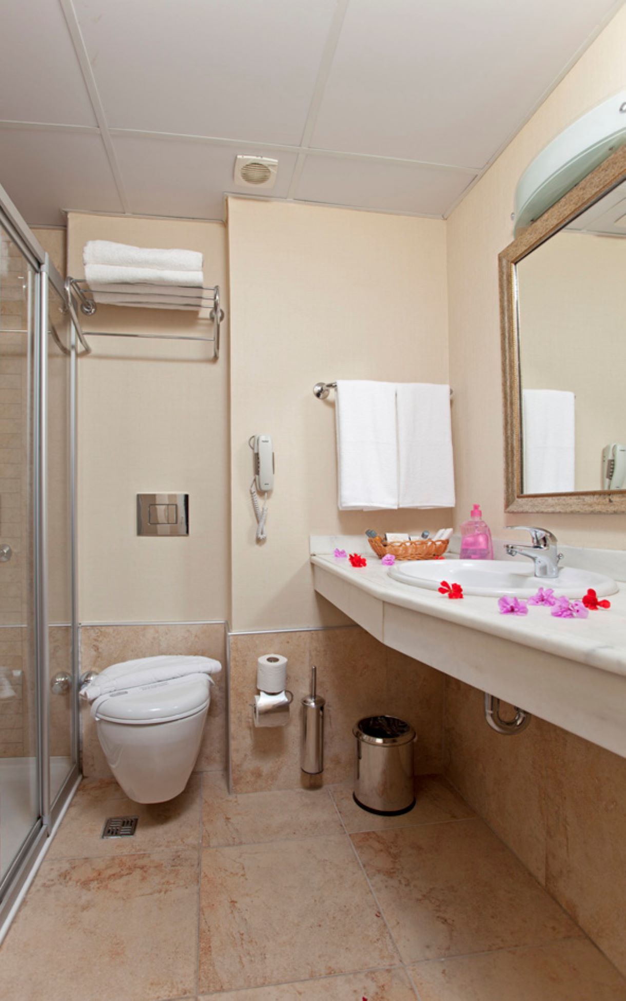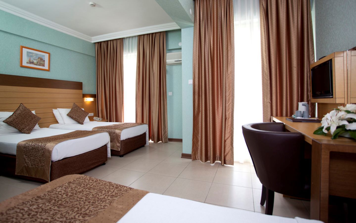 SMEŠTAJ: Hotel ima ukupno 82 sobe. Standardne sobe (jedna spavaća soba, jedno kupatilo, max. 2+1 pax). Sve sobe imaju privatno kupatilo sa tuš kabinom, fen, klima, direktna telefonska linija, mini bar (dodatno se naplaćuje), sef (dodatno se naplaćuje), satelitska TV i muzički kanali, keramički pod i balkon.