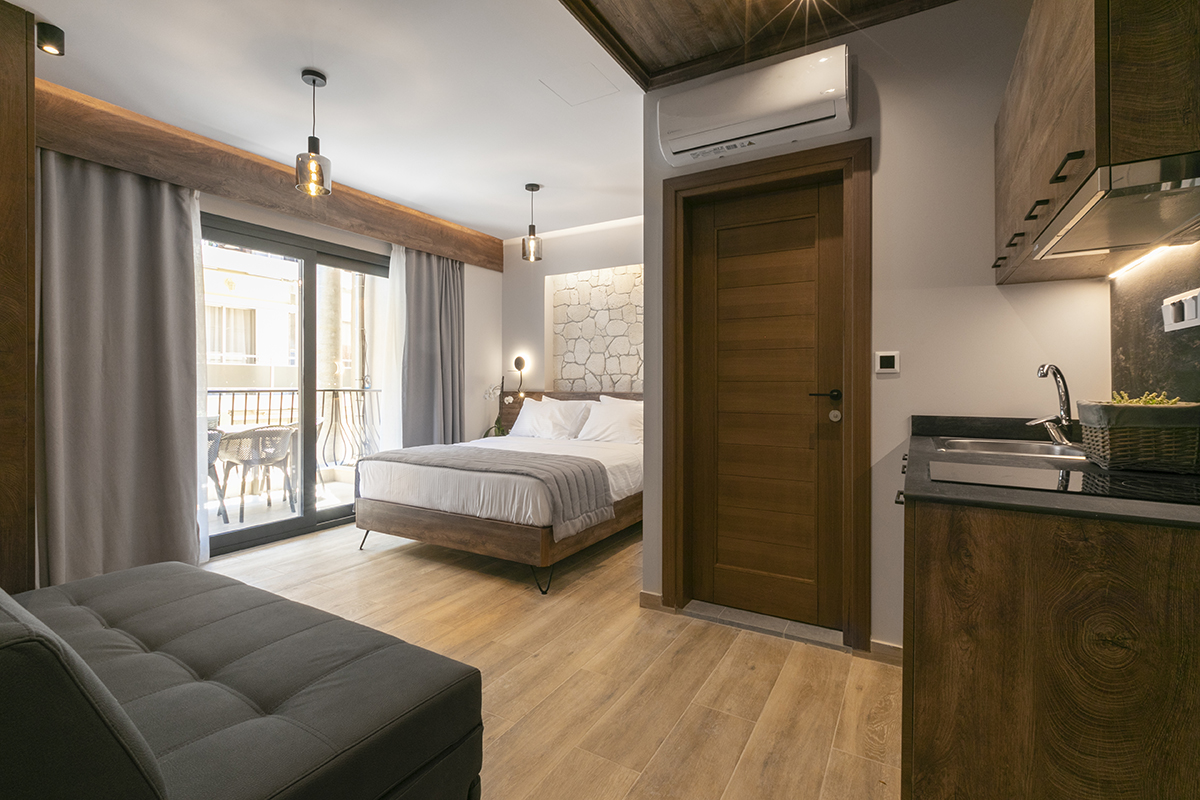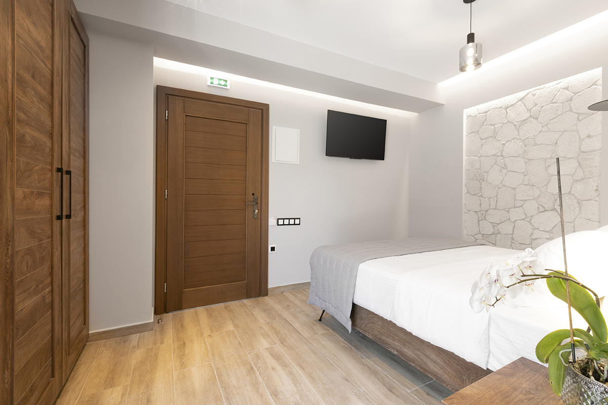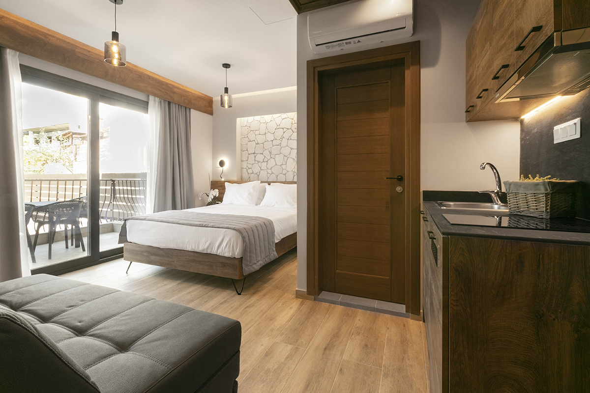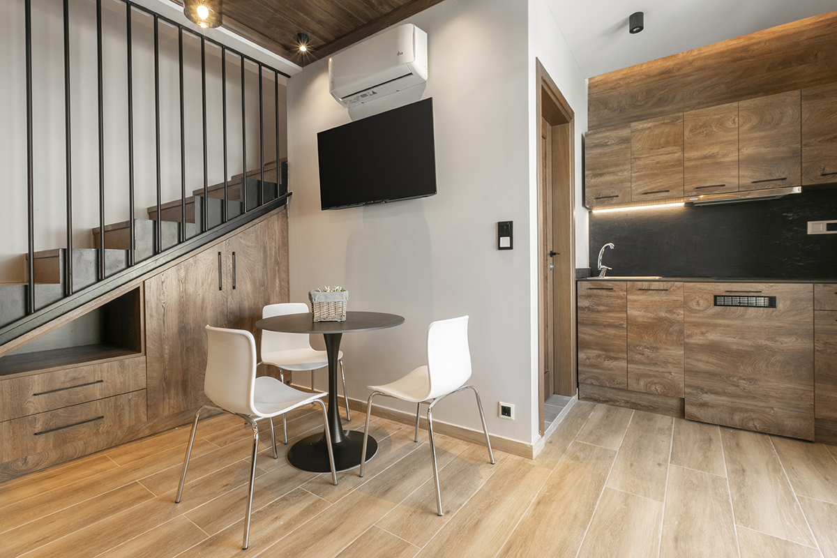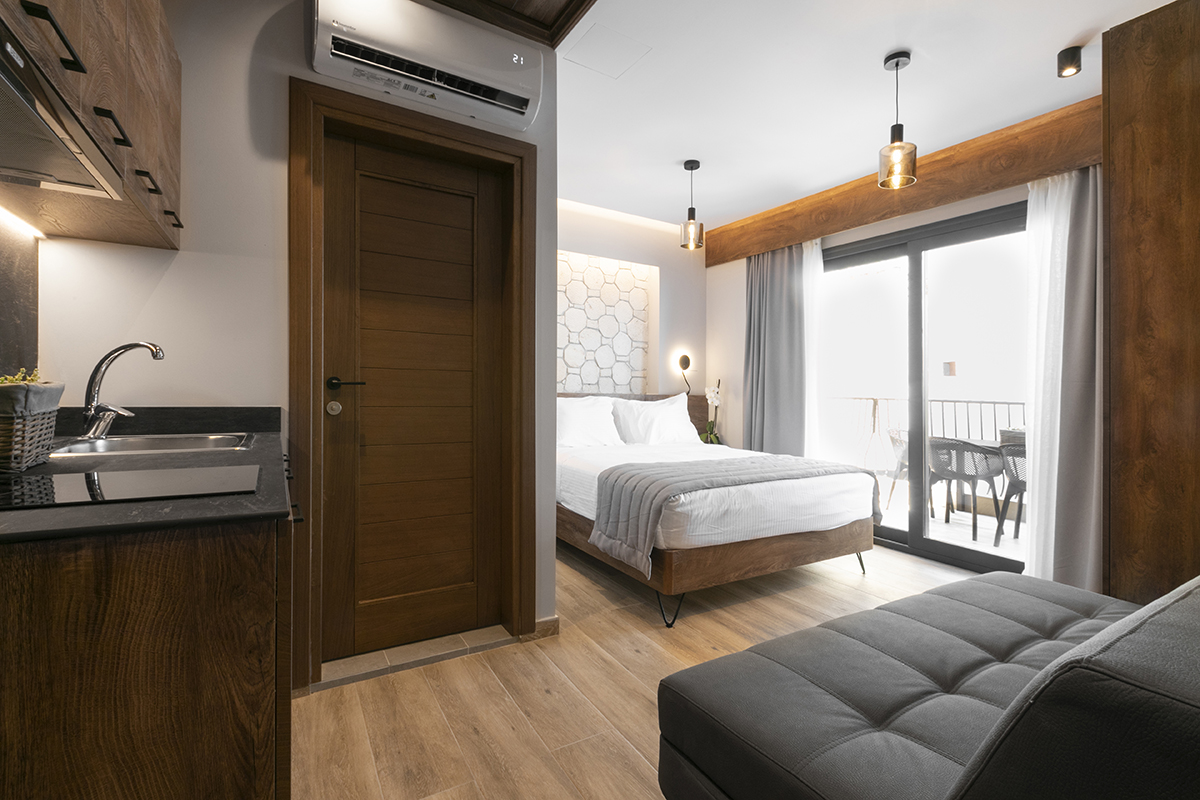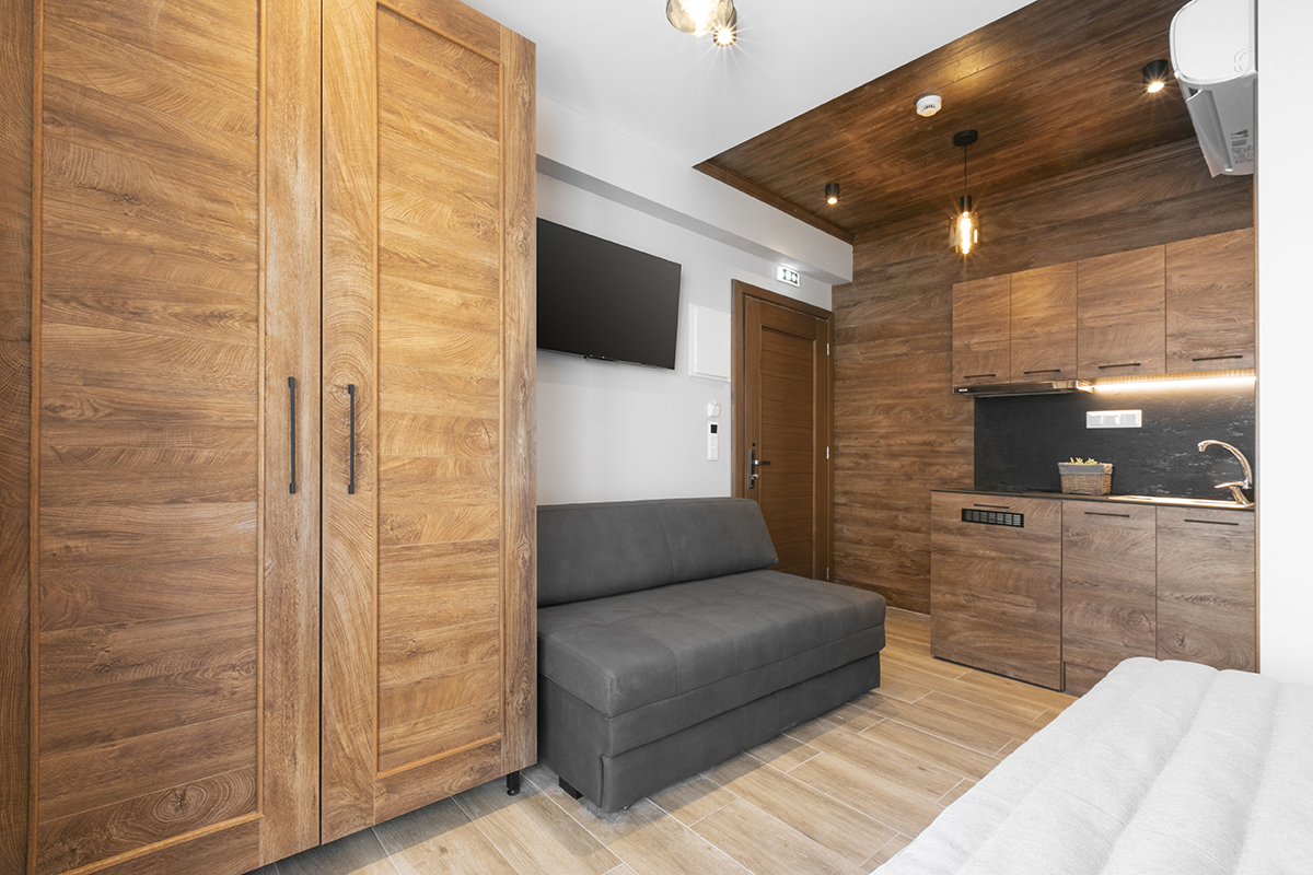 Dvokrevetni studio: Studiji se nalaze na prvom i drugom spratu i sastoje se od francuskog ležaja dimenzija 200x140cm, TV/KAT, klima uređaj (korišćenje je besplatno), noćni stočić, orman, kao i kuhinjski deo koji je u potpunosti opremljen sa posuđem, rešo sa dve ringle, frižider, aspirator. Kupatila imaju tuš/wc.