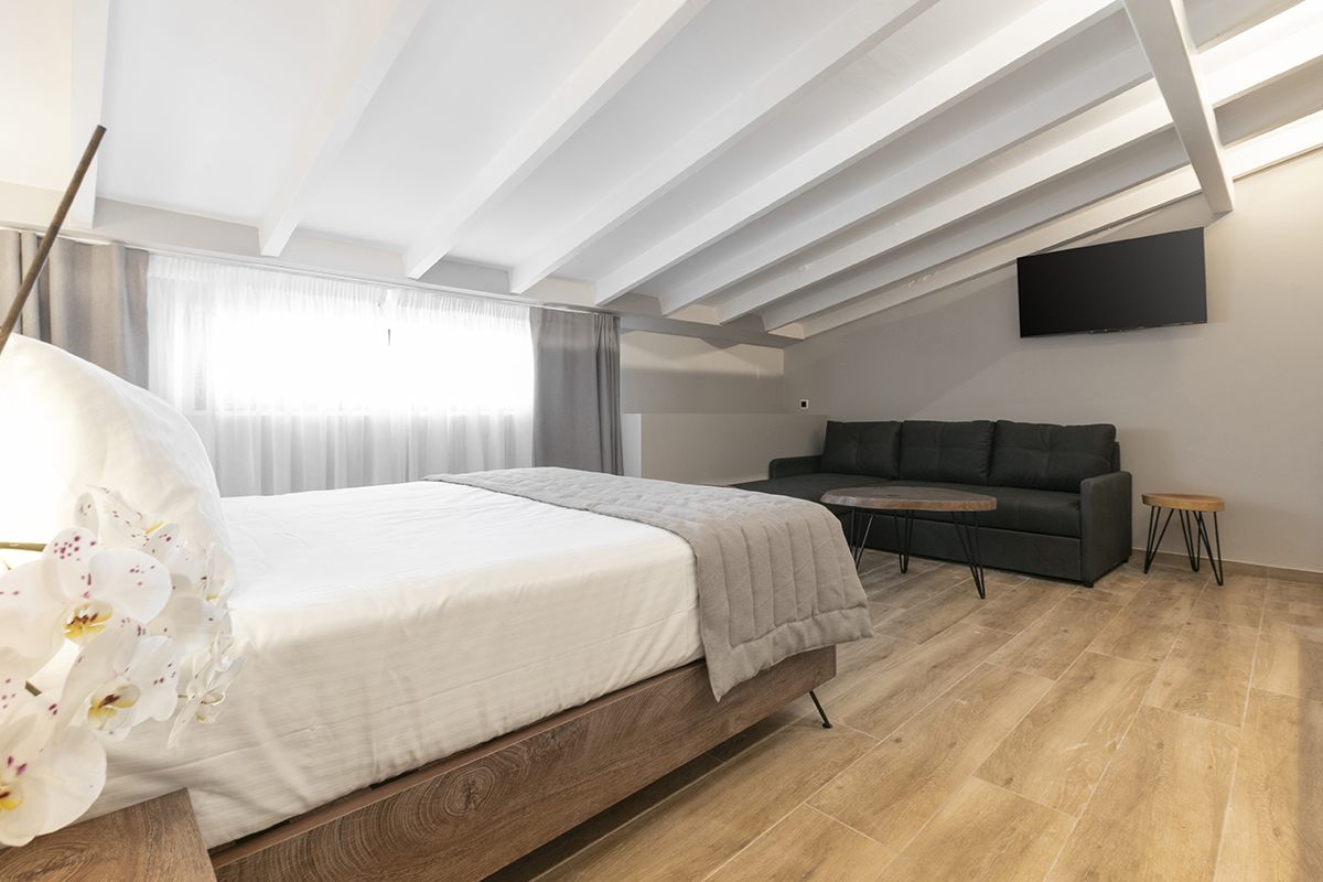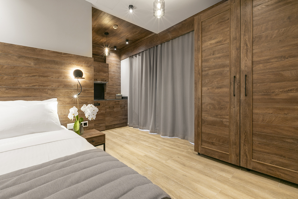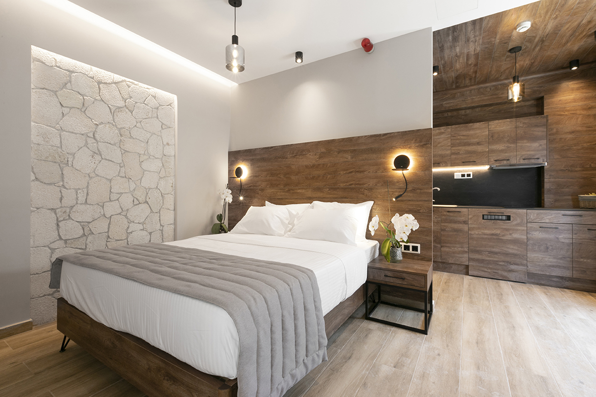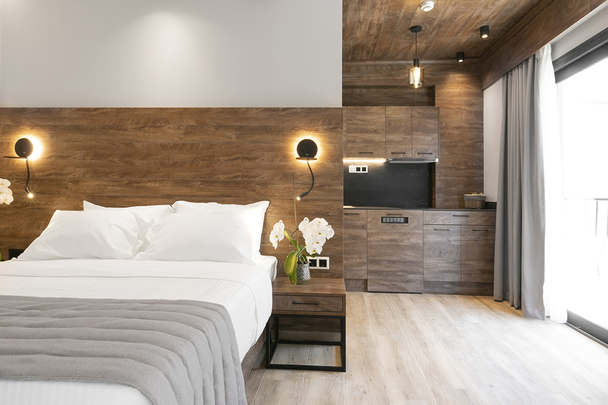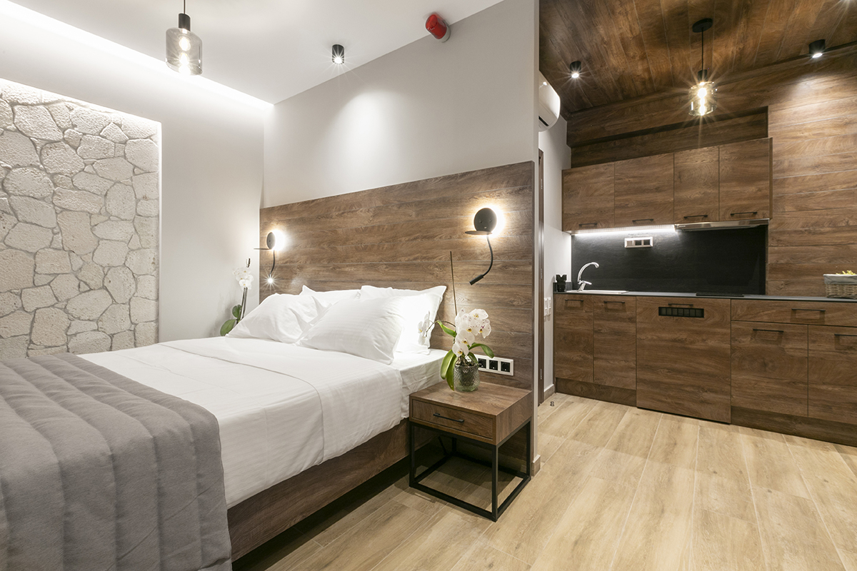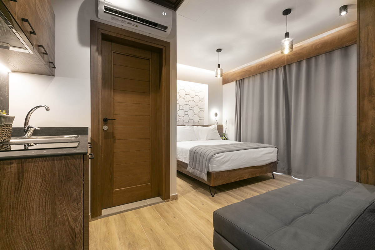 Dvokrevetni studio: Studiji se nalaze na prvom i drugom spratu i sastoje se od francuskog ležaja dimenzija 200x140cm, TV/KAT, klima uređaj (korišćenje je besplatno), noćni stočić, orman, kao i kuhinjski deo koji je u potpunosti opremljen sa posuđem, rešo sa dve ringle, frižider, aspirator. Kupatila imaju tuš/wc.
