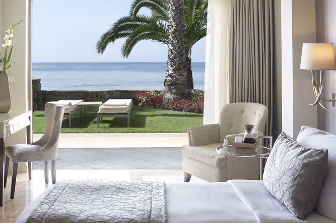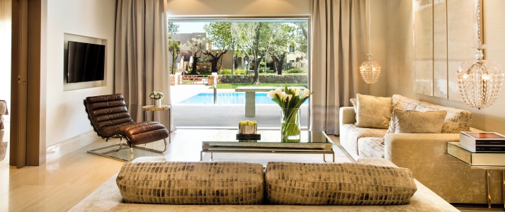 Junior suite – pogled na more,plažu : oko 50 m2, kombinovana dnevno-spavaća soba sa pogledom na Sani marinu ili plažu, namenjene su za 2 odrasle osobe.