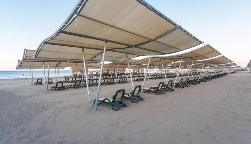 Hotelska plaža je peščana i udaljena je 700m od hotela (prelazi se ulica do plaže). Ležaljke, suncobrani i peškiri za plažu su besplatni za goste hotela. Na plaži se nalaze bar i restoran sa brzom hranom