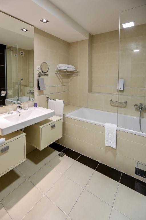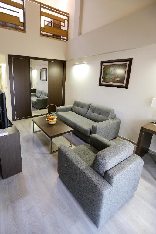 - Deluxe apartman - oko 116 m2, za 1-2 odrasle osobe sa velikim balkonom, francuskim ležajem 200x200, dnevnim boravkom, WC, 2 LCD -a, sef, telefon, fen, wi/fi internet besplatno, kupatilo sa hidromasažnom kadom i tuš kabinom, “walk-in” garderober i kuhinja sa posebnim ulazom za poslugu, bade mantil i papuče, mini-bar uz naplatu.