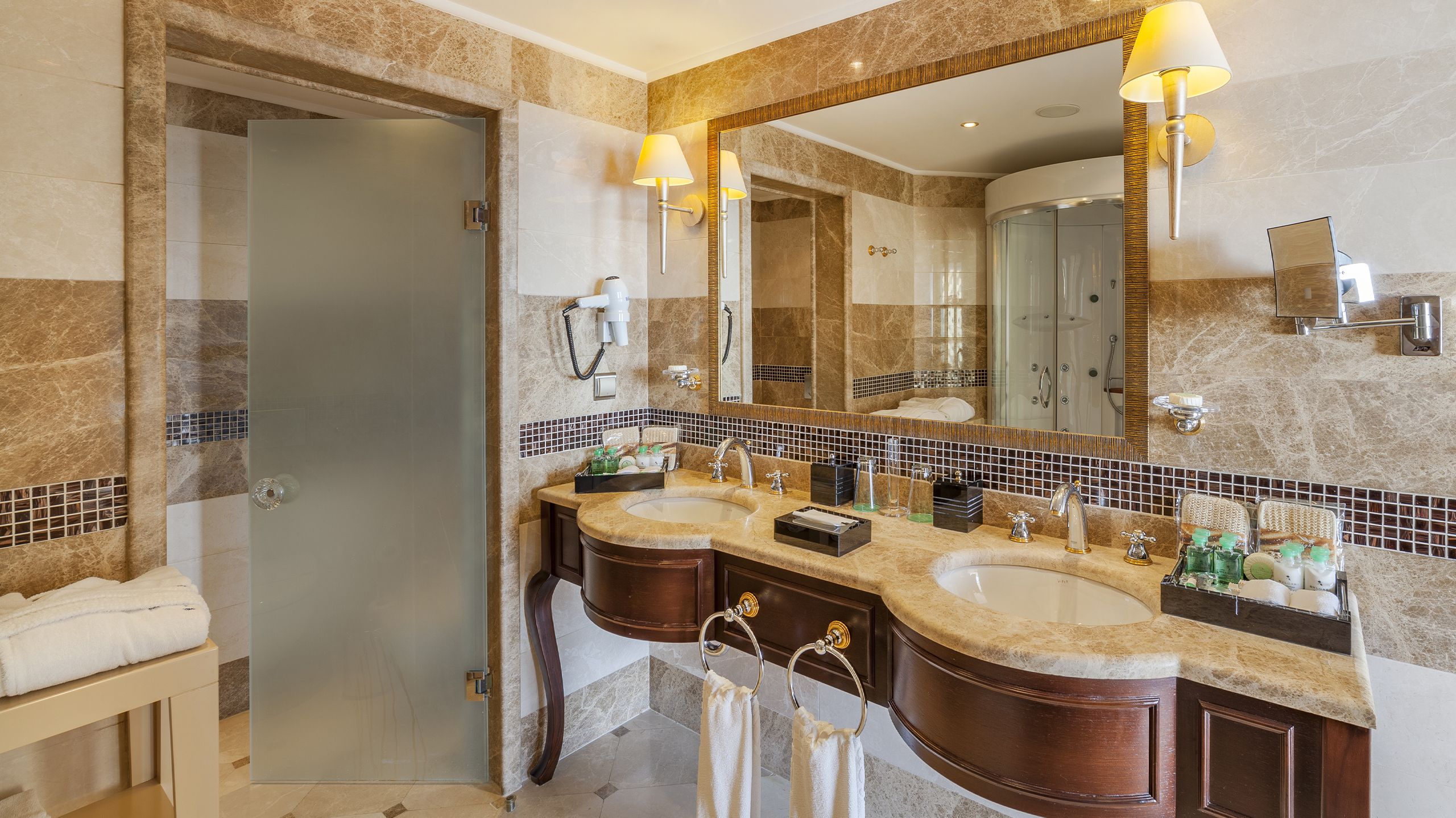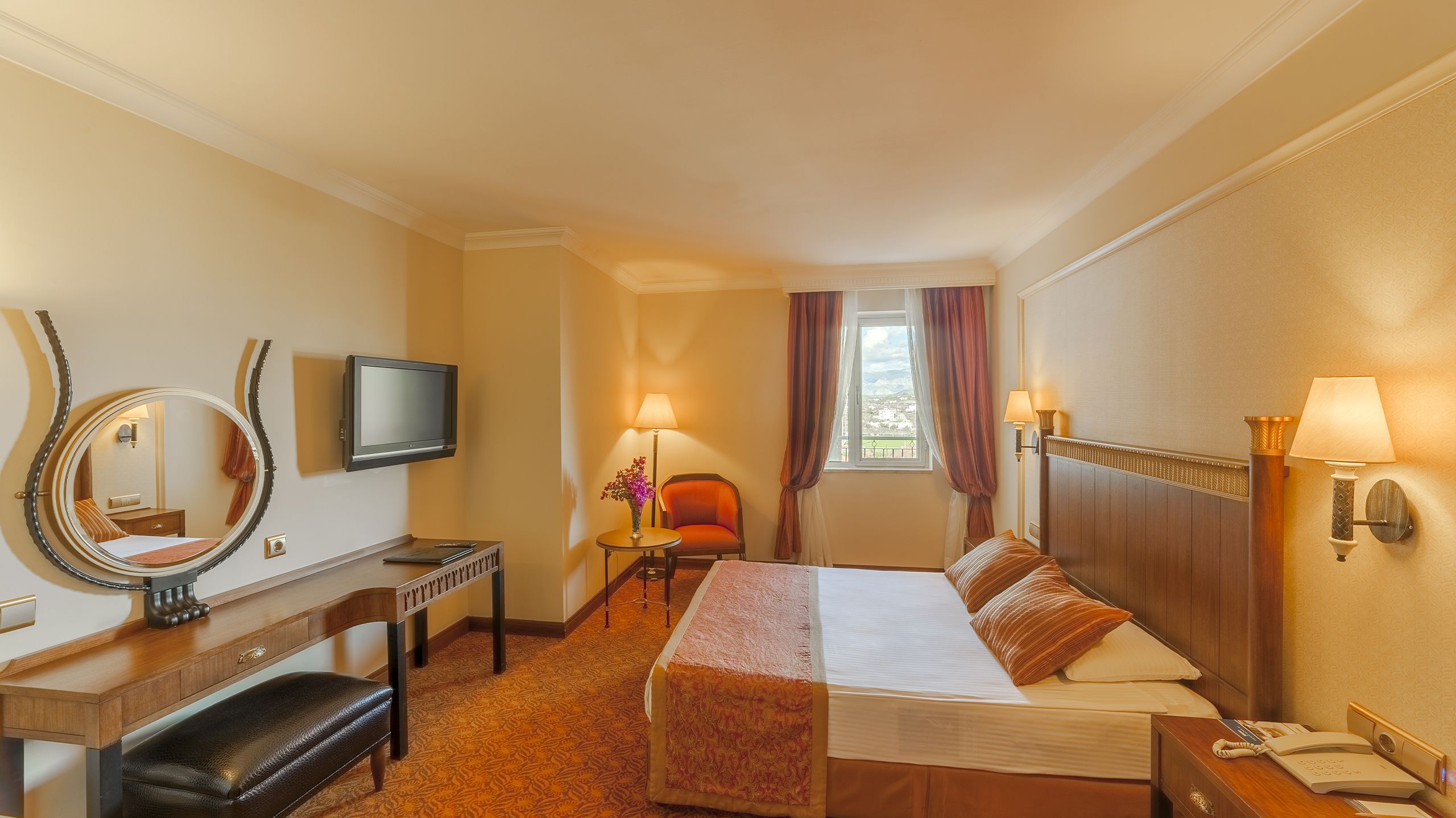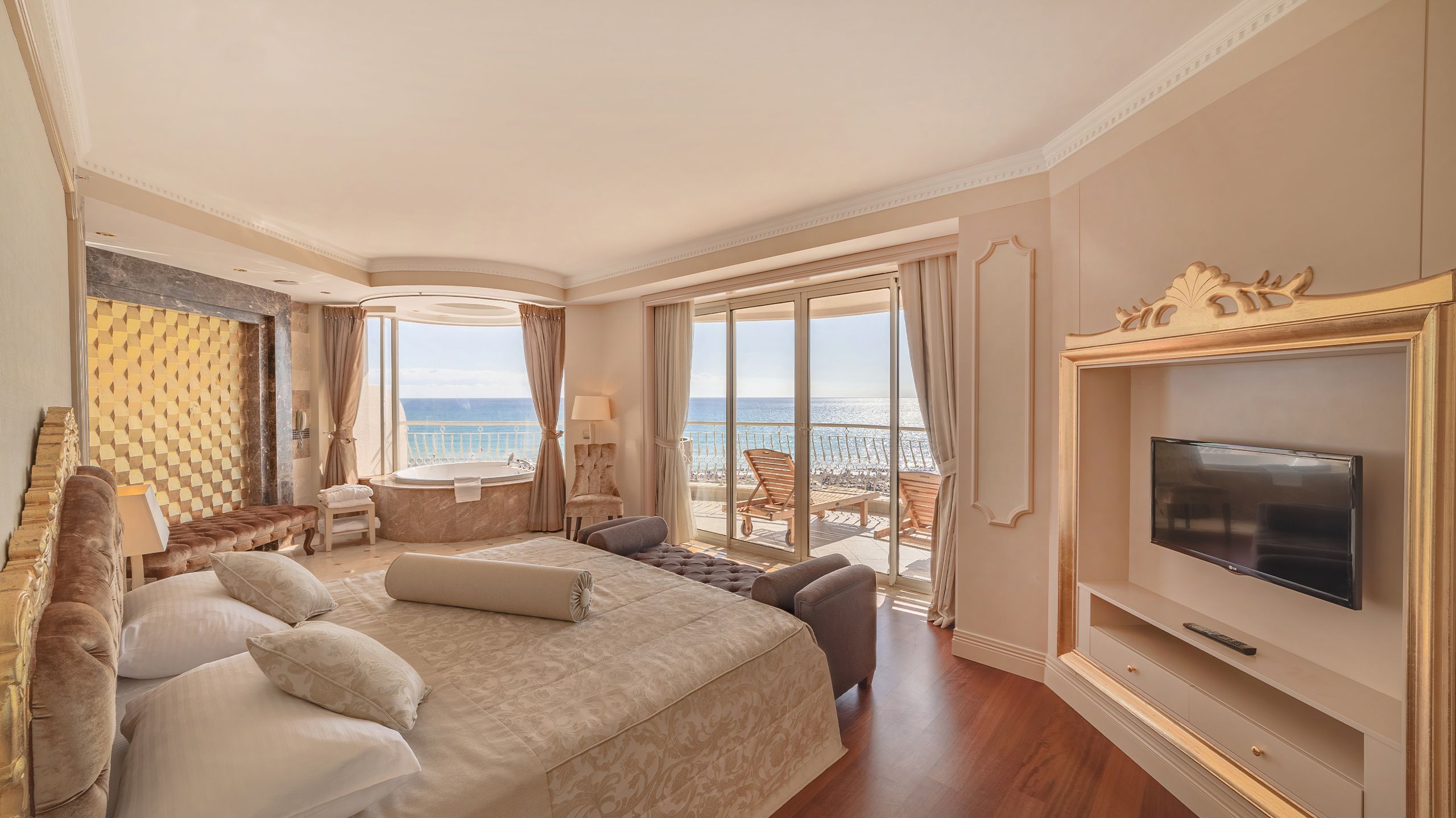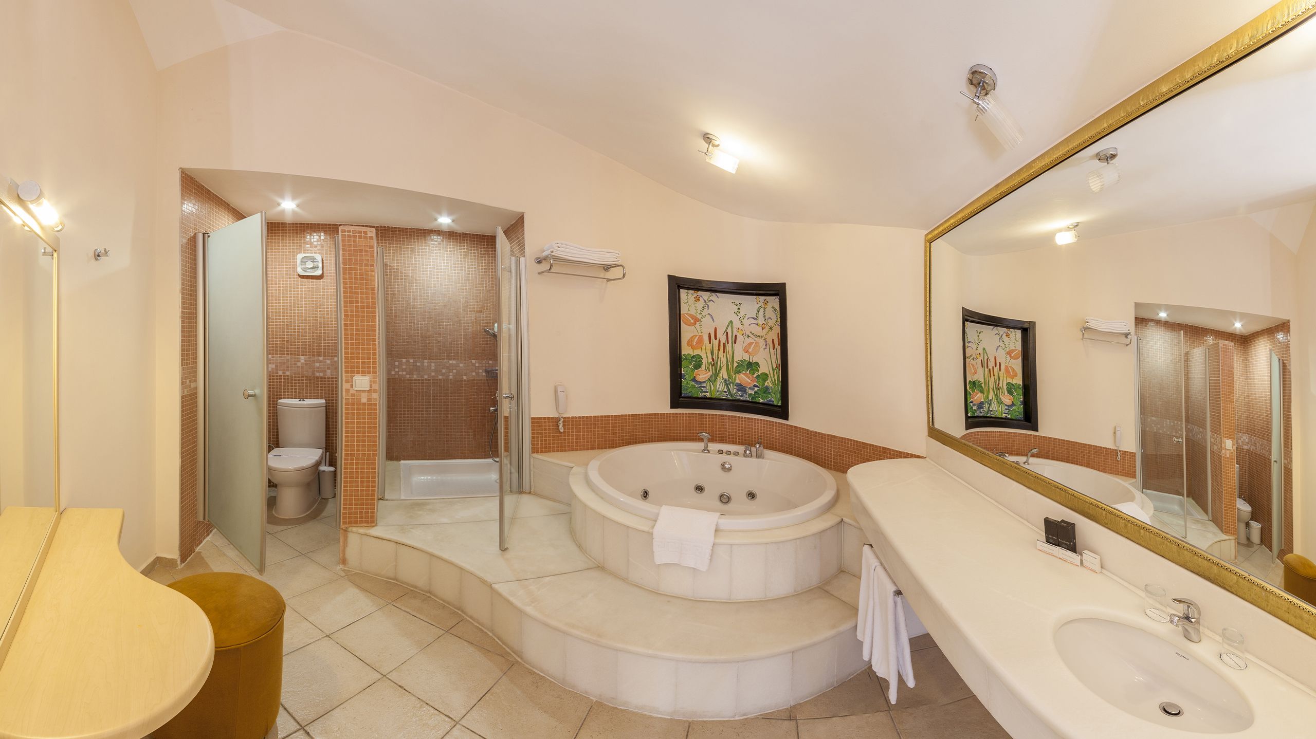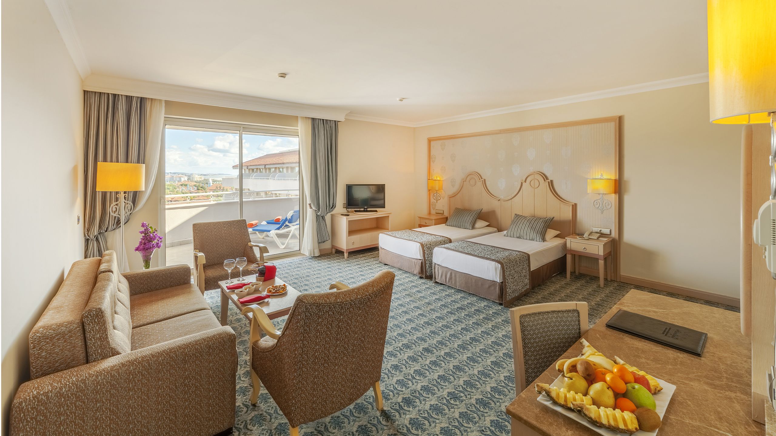 Ukupan broj soba - 824 raspoređene u glavnoj zgradi i 18 u club zgradama. Glavna zgrada: deluxe sobe pogled kopno (41m2, jedna spavaća soba sa francuskim krevetom, jedno kupatilo, max 2 pax), deluxe sobe pogled more (46m2, jedna spavaća soba sa francuskim krevetom+jedan single krevet, jedno kupatilo, max 2+1 pax), corner jacuzzi suit (53-66m2, spavaća soba sa francuskim krevetom, dnevni boravak, vrata između, 55m2 duga terasa, max 2+1 pax), deluxe suit (70m2, spavaća soba sa francuskim krevetom, dnevni boravak, vrata između, kupatilo, max 2+1 pax), king suit (230m2, dve odvojene spavaće sobe, dnevni boravak, dva kupatila, 45m2 duga terasa, max 4 pax). Club dio: superior sobe (31m2, jedna spavaća soba sa francuskim krevetom ili odvojeni kreveti+sofa, jedno kupatilo, max 2+1 pax), jacuzzi duplex (70m2, dve sobe odvojene vratima, dva kupatila, na spratu se nalazi jacuzzi, max 2+2 pax), suit soba (87m2, dve spavaće sobe bez vrata između, kupatilo, max 4 pax) i 8 soba prilagođene osobama sa invaliditetom. Sve sobe imaju: privatno kupatilo sa kadom ili tuš kabinom, fen, papuče, centralni klima sistem koja radi u zavisnosti od vremenskih uslova, direktnu telefonsku liniju, mini bar (voda, mineralna voda, bezalkoholna pića i pivo dopunjuju se dnevno), set za kafu i čaj, sef, tepih u sobama u glavnoj zgradi, parket u club sobama, satelitska TV i muzički kanali, Wi-Fi internet (mala brzina), balkon (neke club superior sobe su bez balkona).